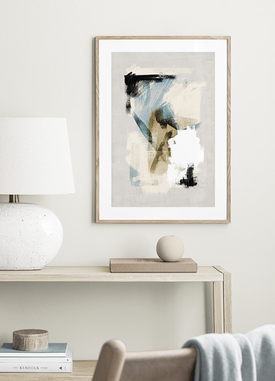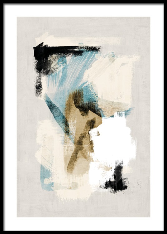 Handpicked Abstraktes Gemälde in Blau, Weiß, Beige und Schwarz, auf beigem Hintergrund mit Farbstruktur. Die gedämpften Farben mit einem Spritzer Blau in der Mitte ergeben eine perfekte Kombination! Dieses Motiv passt auch zu Abstract Brushes No. 2.