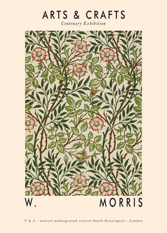 Handpicked Illustration mit roten Blumen und grünen Blättern auf beigem Hintergrund mit dem Text „Arts & Crafts“ darüber und darunter. Der Look, der von William Morris inspiriert ist, wird so bald nicht aus der Mode kommen! Die gedämpften Farben und das Blumenmuster sind die perfekte Kombination von Retro und Modern.
