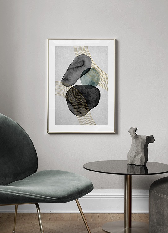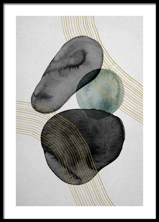 Handpicked Illustration mit schwarzen und blauen Formen in Aquarell und goldenen Streifen (keine Goldfolie) vor grauem Hintergrund. Dieses Poster passt perfekt in ein Wohnzimmer – vor allem zusammen mit Ash and Moss No2. Beide zusammen bilden ein perfektes Paar!