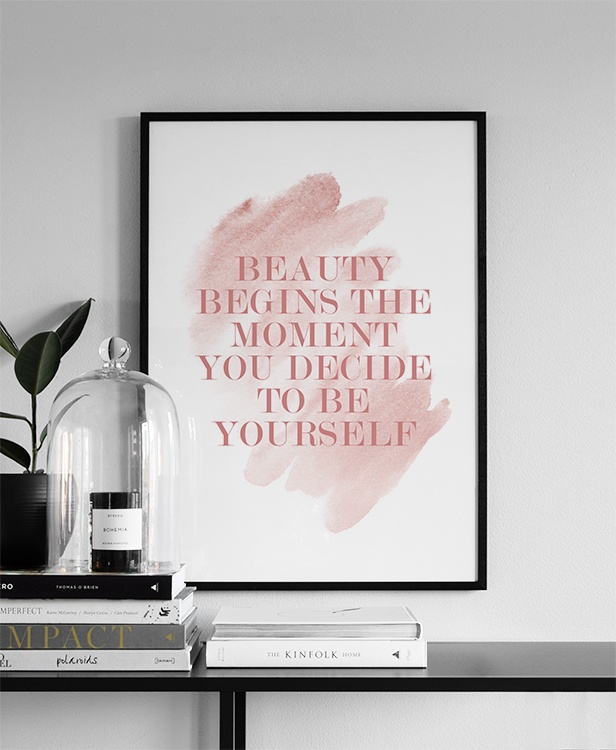 Handpicked Zitatebild mit dem Text „Beauty begins the moment you decide to be yourself“ mit rosa Aquarellhintergrund. Kombiniere dieses Poster mit anderen Fashion-Postern, um die perfekte Bilderwand zu gestalten, und fülle dein Zuhause mit inspirierender Kunst, die dir hilft, den Kopf nicht hängenzulassen!