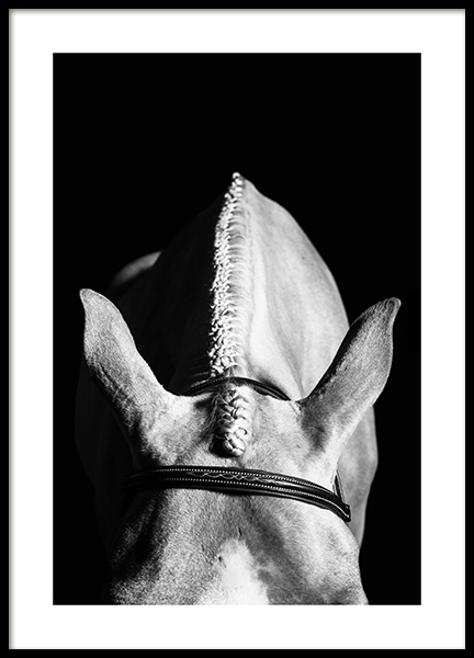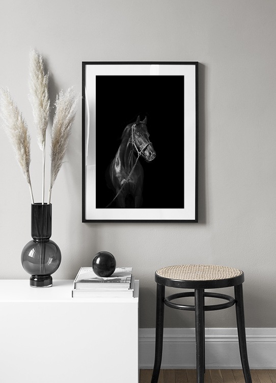 Handpicked Fotografie eines schwarzen Pferdes mit Halfter in Schwarz-weiß vor einem schwarzen Hintergrund. Viele haben dieses herrliche Geschöpf als Lieblingstier, und wenn du deinen Wänden eine elegante Note geben möchtest, ist dieses Motiv perfekt.