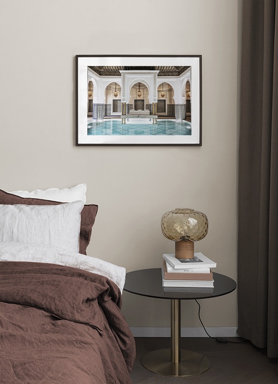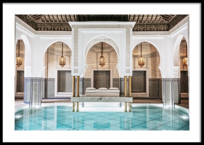 Handpicked Fotografie eines Pools in einem Raum mit goldenen Lampen, blauen Säulen und weißen, geschwungenen Bögen. Dieser geheime Ort verbindet großartige Traditionen mit Kunstfertigkeit, sodass wir uns immer wieder neu verlieben. Das Poster gehört zu Studio Amara, einer Fotokollektion, die vom Desenio Design Studio in Marrakesch aufgenommen wurde.