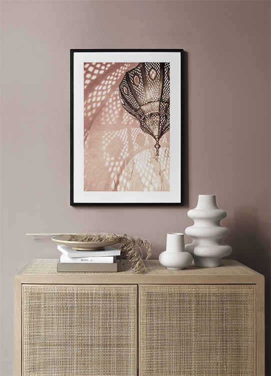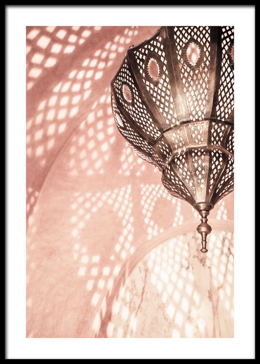 Handpicked Fotografie einer Metalllampe, die in einem rosa Raum Licht reflektiert. Finde dein neues Lieblingsposter unter den Fotografien aus Marrakesch! Das Poster gehört zu Studio Amara, einer Fotokollektion, die vom Desenio Design Studio in Marrakesch aufgenommen wurde.