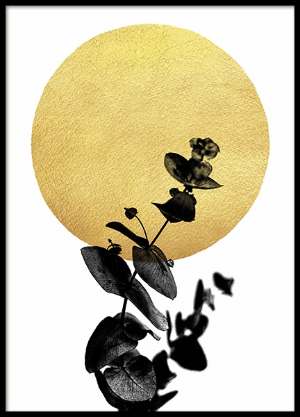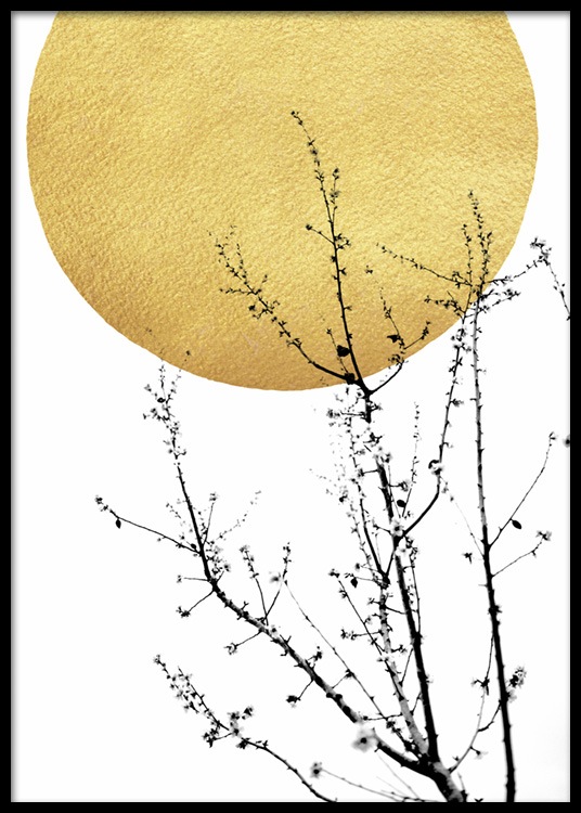 – Abstraktes Poster mit einer goldenen Sonne und einem Busch in Schwarz.