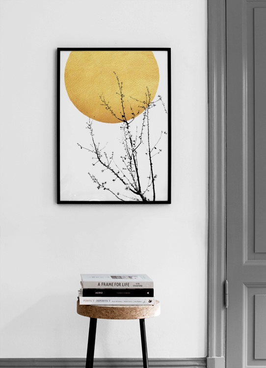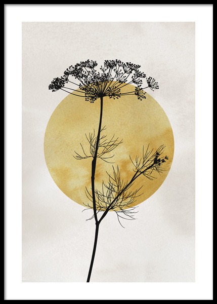 Handpicked Grafische Illustration mit schwarzen Zweigen vor einer gelben Sonne und einem weißen Hintergrund. Wenn du einen modernen Look gestalten und ein paar trendige Akzente in dein Zuhause bringen möchtest, sind grafische Kunst und Illustrationen die perfekte Wahl! Wähle aus unserer Kategorie Grafische Kunst andere Poster zum Kombinieren aus.