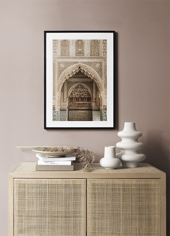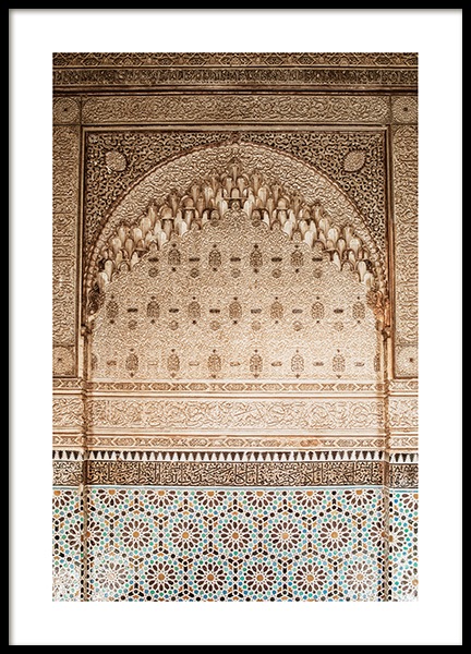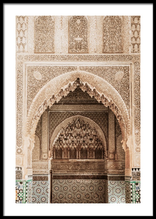 Handpicked Fotografie eines goldenen, geschwungenen Bogens mit geschnitzten Details in einem Bogen. Dieser Ort ist so voller Details und einzigartigem Handwerk, dass er einfach magisch ist. Das Poster gehört zu Studio Amara, einer Fotokollektion, die vom Desenio Design Studio in Marrakesch aufgenommen wurde.