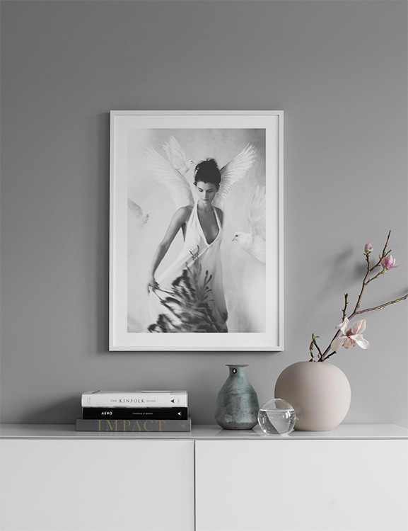 Handpicked Tove Franks Fotoposter Halo aus der Serie Essence gehört zu unseren sorgfältig ausgewählten Motiven, die wir in der Kategorie Handpicked zusammengestellt haben. Das Poster Halo ist eine schöne Schwarz-Weiß-Fotografie, die eine Frau mit weißen Engelsflügeln porträtiert. Die weißen Tauben, von denen die Frau im Bild umgeben ist, sind Ausdruck von Frieden und Liebe. Sie fangen die Stimmung ein, die zum Synonym von Tove Franks Kunst geworden ist. Das Poster Halo von Tove Frank hat einen ?eingebauten? Passepartout, der dem Motiv einen schönen Rahmen verleiht.
