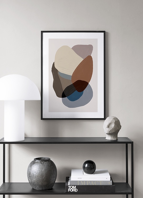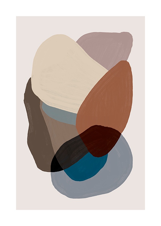 Peinture avec un amas de formes dans différentes nuances de marron et bleu sur un fond beige. En choisissant des affiches aux couleurs terreuses et calmes, votre maison semblera agréable ! Cette affiche se marie à merveille avec Browns and Blues No2.