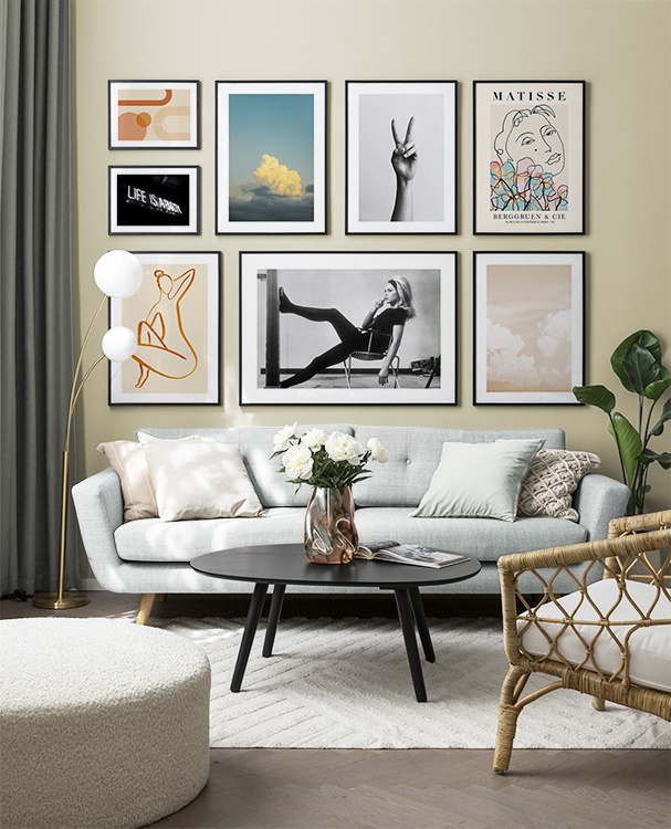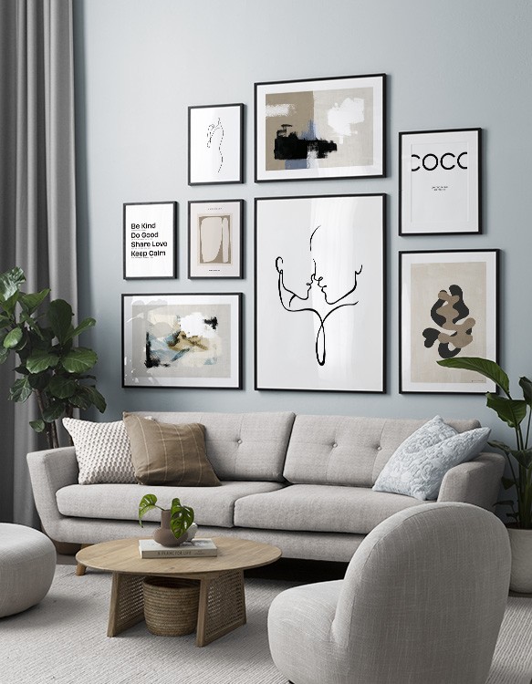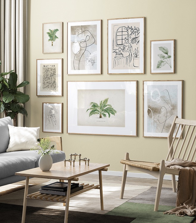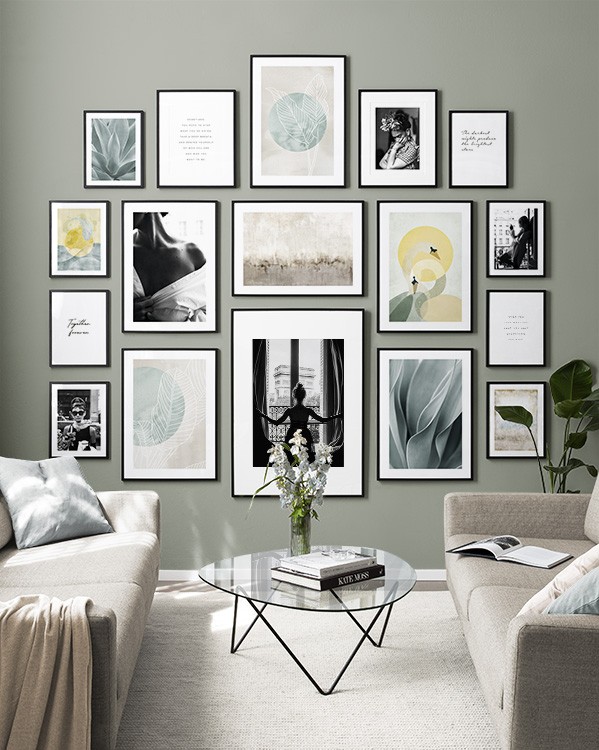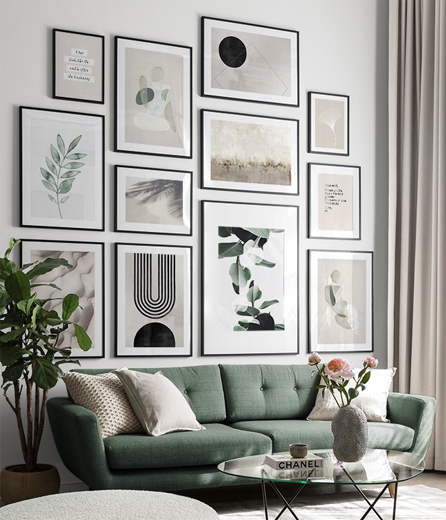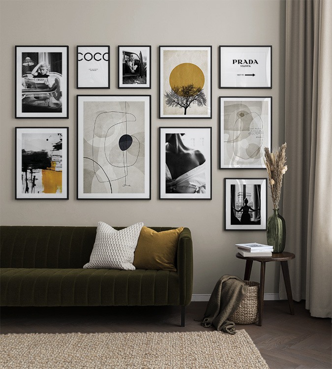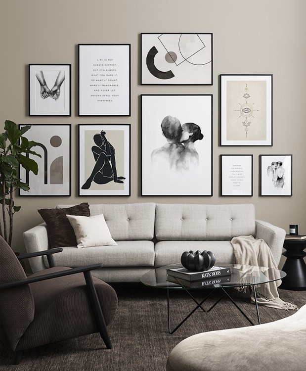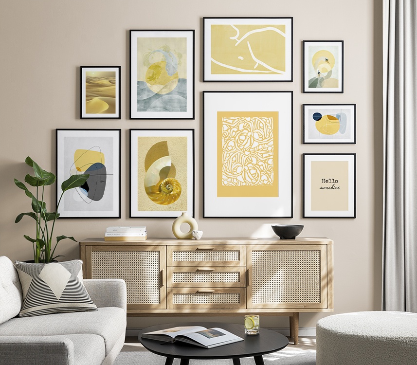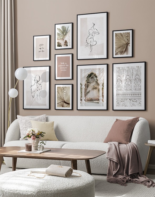 Trouvez l'inspiration et des conseils de décoration pour le salon sur la façon dont vous pouvez orner les grands murs du salon avec des tableaux et des décorations murales. Le salon est généralement la plus grande pièce de la maison et ses murs spacieux sont parfaits pour accueillir une composition de tableaux expressive et élégante. N’hésitez pas à utiliser des affiches de différentes tailles et formats pour composer un mur de tableaux ludique et vibrant et qui reflète votre personnalité.