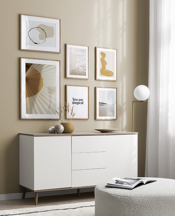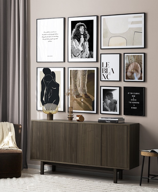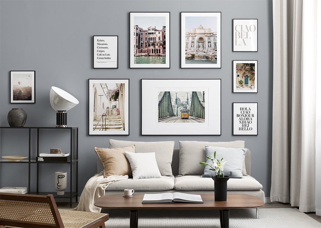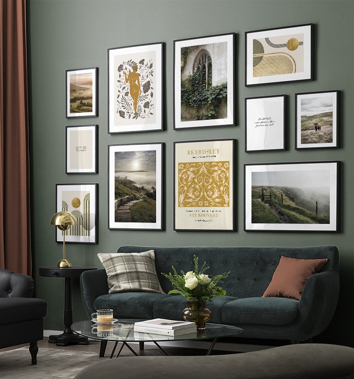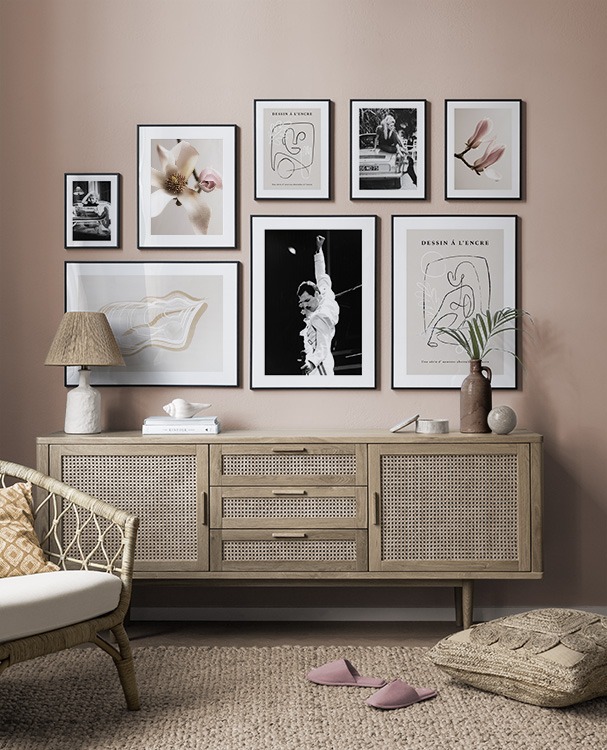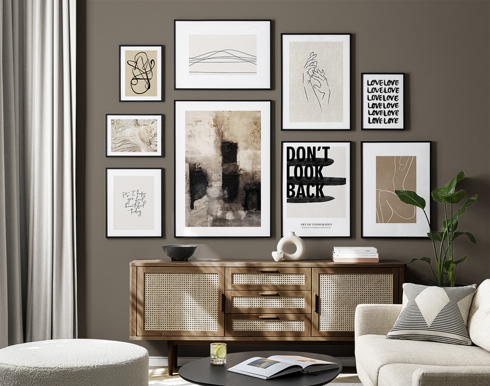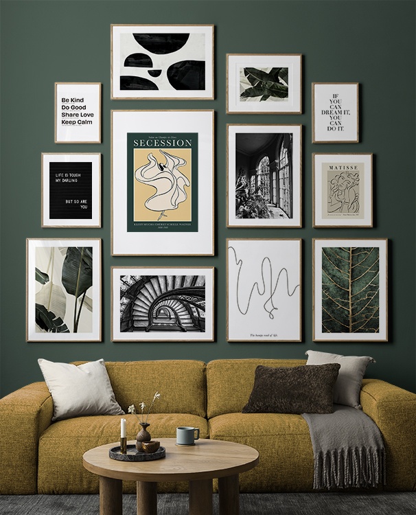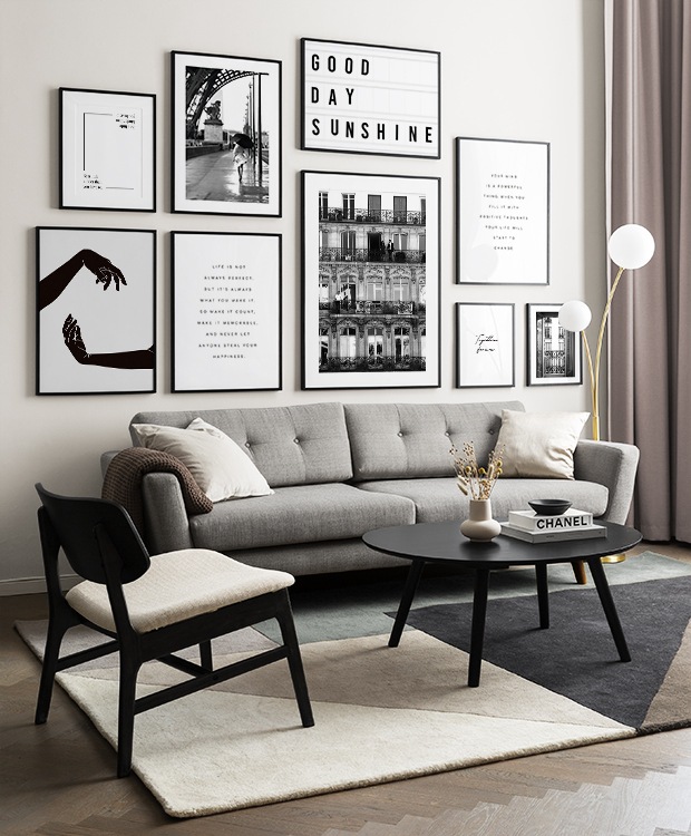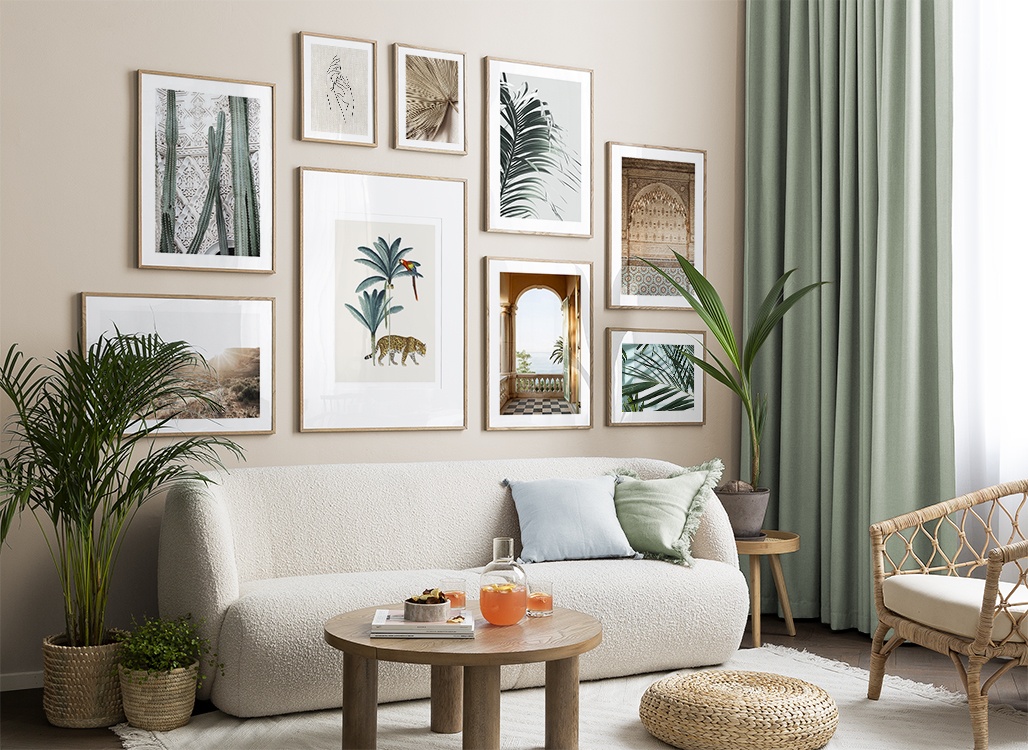Trouvez l'inspiration et des conseils de décoration pour le salon sur la façon dont vous pouvez orner les grands murs du salon avec des tableaux et des décorations murales. Le salon est généralement la plus grande pièce de la maison et ses murs spacieux sont parfaits pour accueillir une composition de tableaux expressive et élégante. N’hésitez pas à utiliser des affiches de différentes tailles et formats pour composer un mur de tableaux ludique et vibrant et qui reflète votre personnalité.