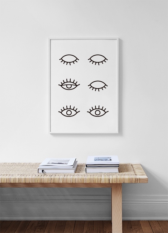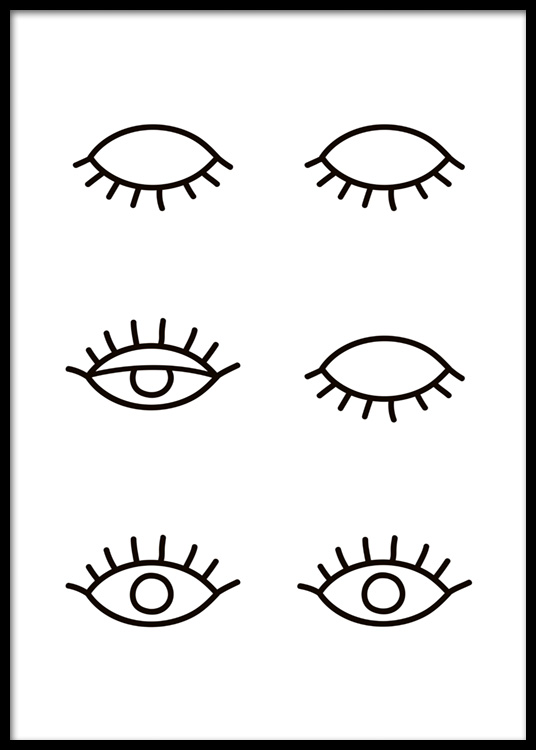 Une affiche illustrée avec trois paires d’yeux différentes. Cette affiche minimaliste se fond joliment dans la plupart des pièces et peut même être combinée avec des affiches en couleur et noir et blanc.
