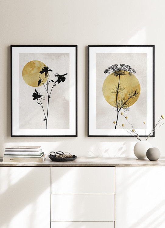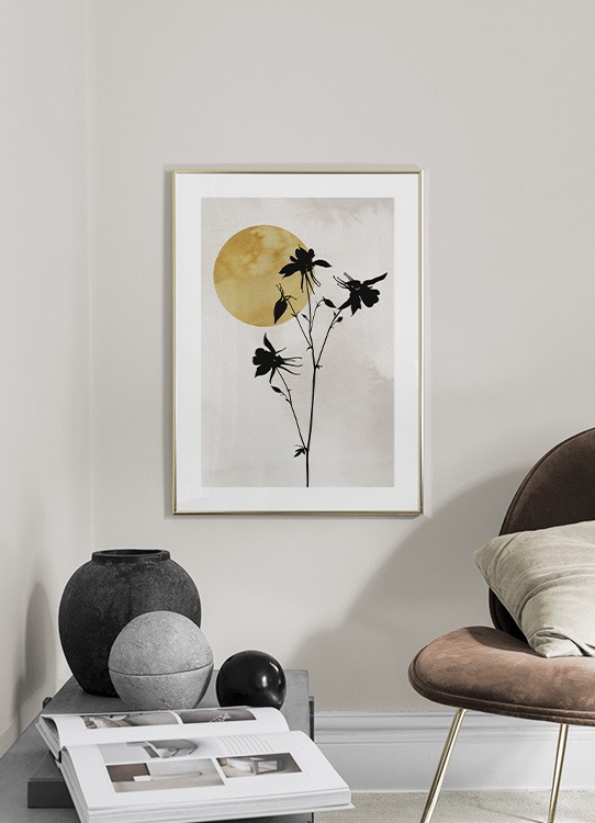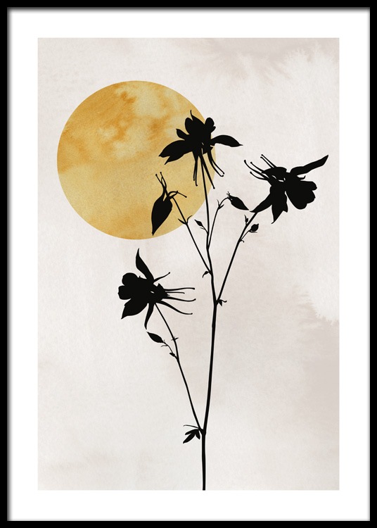 Illustration de fleurs noires avec un soleil jaune foncé dans l’angle, sur un fond beige. Attirez l’attention de chacun sur vos murs avec cette belle illustration ! La structure de couleur de l’arrière-plan donne une profondeur subtile à l’affiche.