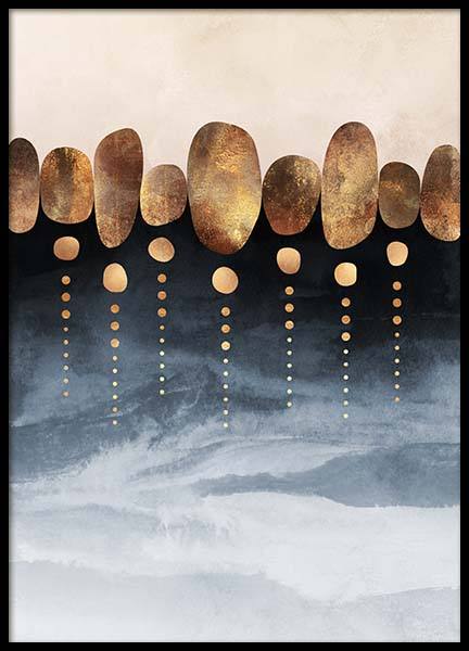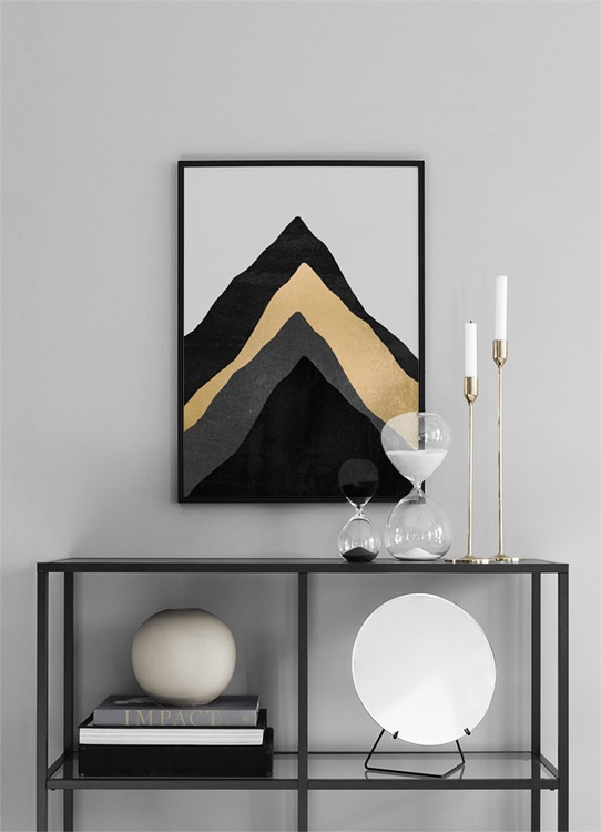 Affiche élégante représentant un motif créé par la designer Elisabeth Fredriksson. Belle affiche au motif artistique graphique en noir, or et gris. Le motif moderne, qui rappelle une montagne, s’accorde parfaitement à la plupart des pièces. Une affiche de ce style peut être combinée à d’autres affiches pour créer un mur de tableaux unique. Nous proposons un large assortiment de tableaux modernes. Lesquels choisissez-vous pour décorer votre intérieur ?