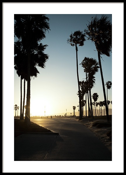 Palmiers, plage et coucher de soleil - une combinaison parfaite que notre équipe de création a su capturer sur cette magnifique image durant sa promenade le long de la plage de Los Angeles. Le soleil descend rapidement mais notre équipe a réussi à en capturer l'image juste au bon moment. L'affiche comporte une bordure blanche qui encadre joliment le motif.