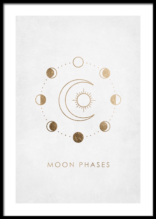 Illustration graphique de petits cercles dorés (pas de feuille d’or) entourant une lune et le soleil sur un fond gris, avec le texte « Moon phases » en dessous. Si vous avez un faible pour l’espace mystérieux et vaste, cette charmante illustration sera une pièce parfaite !