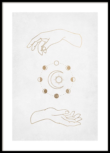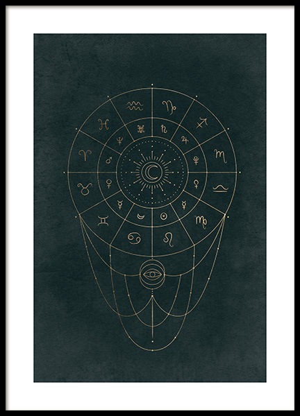 Illustration graphique d’une main avec des signes astronomiques dorés (pas de feuille d’or) dans la paume sur un fond vert foncé. Pour ceux qui s’intéressent à l’astronomie, cette affiche minimaliste est un ajout parfait et aura fière allure dans n’importe quelle pièce de votre maison.