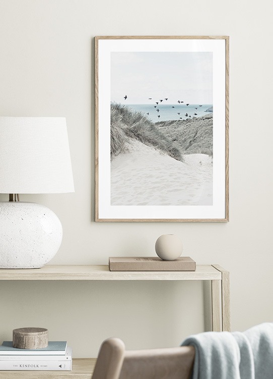 Handpicked Foto van een vlucht vogels die over zandduinen en gras vliegen, met een blauwe oceaan op de achtergrond. Natuurposters met een sereen uitzicht en zachte tinten zorgen dat je huis kalm aanvoelt, een perfecte look voor een slaapkamer!