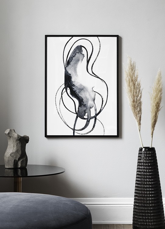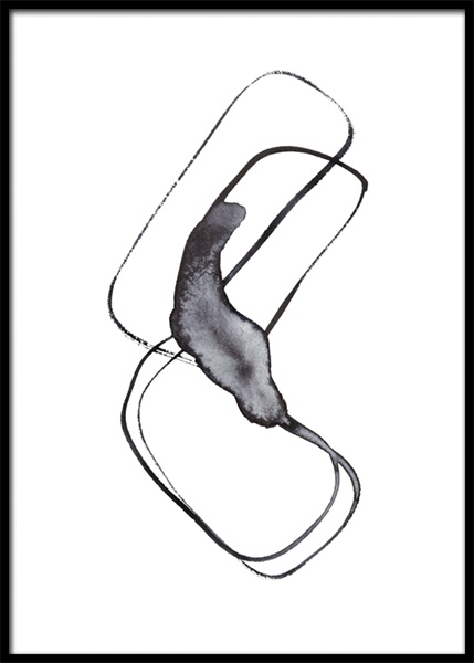 – Schilderij in donkergrijze aquarel van een abstracte vorm en dunne wervelingen tegen een witte achtergrond