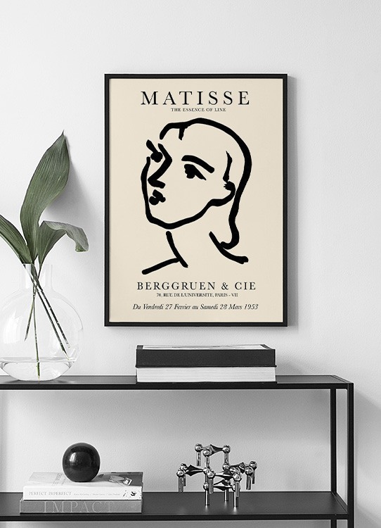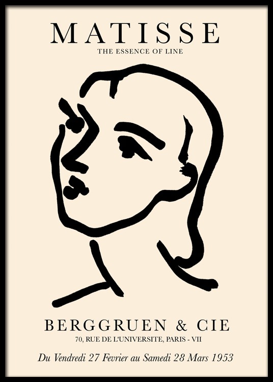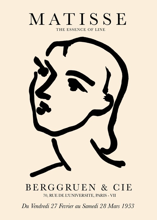 Handpicked Illustratie van een gezicht in dikke, zwarte line art op een beige achtergrond, met de tekst "Matisse The Essence of Line" aan de bovenkant, en tekst aan de onderkant. Matisse is een ware inspiratiebron voor de vele kunstenaars na hem, en de stijl is een klassieker die nooit uit zal raken.