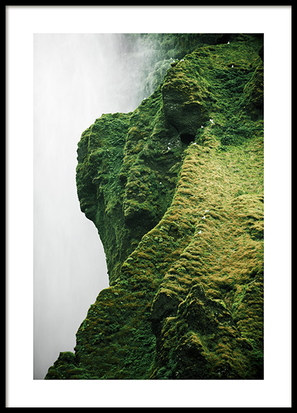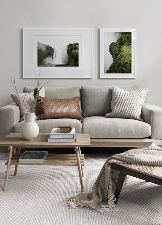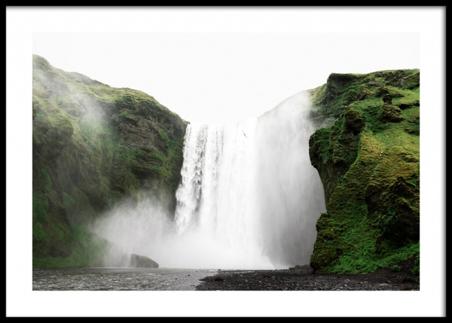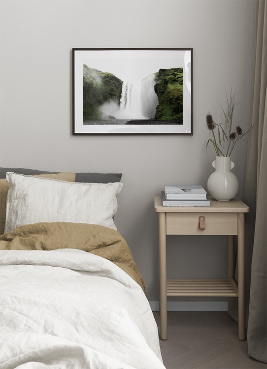 Handpicked Foto van de waterval Skogafoss op IJsland. Ga mee met Desenio Design Studio op een dromerige reis naar IJsland en het noorderlicht, een plek waar je jouw geest tot rust kunt brengen. Studio Elements is een collectie over IJsland, van Desenio.