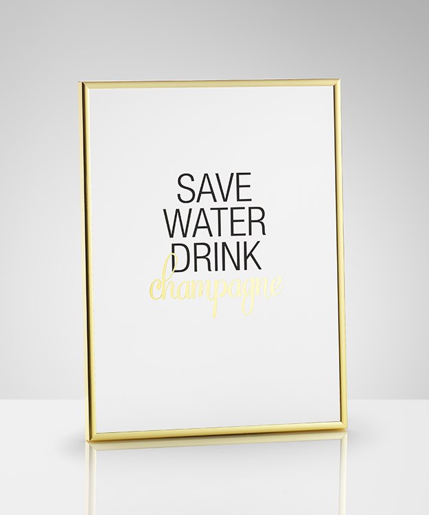 – Quoteposter in zwart en goud met de quote "Save water drink champagne" op een witte achtergrond