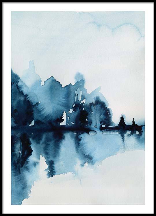Handpicked Een mooie poster met een motief uit de natuur in aquarel. Dit mooie kunstmotief in blauw met bomen die worden weerspiegeld is uitstekend geschikt om ter decoratie op te hangen in bijvoorbeeld een woonkamer. Decoreer uw huis met fraaie kunst om het persoonlijker te maken!