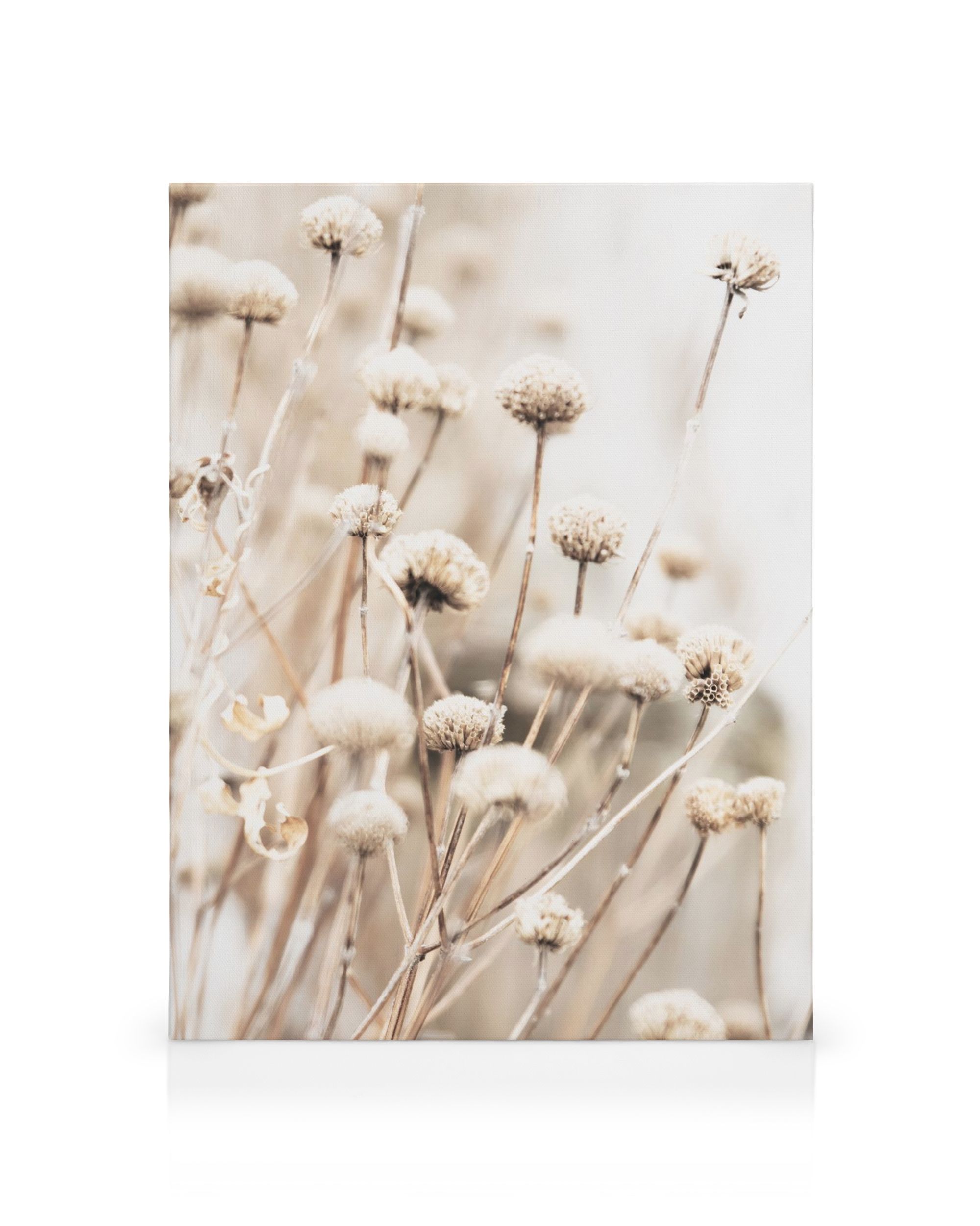 Ab 24,95 €Ein Leinwandbild, das zarte getrocknete Pflanzen mit weichen, flauschigen Spitzen in Weiß-, Beige- und Hellbrauntönen vor einem verschwommenen Hintergrund darstellt.