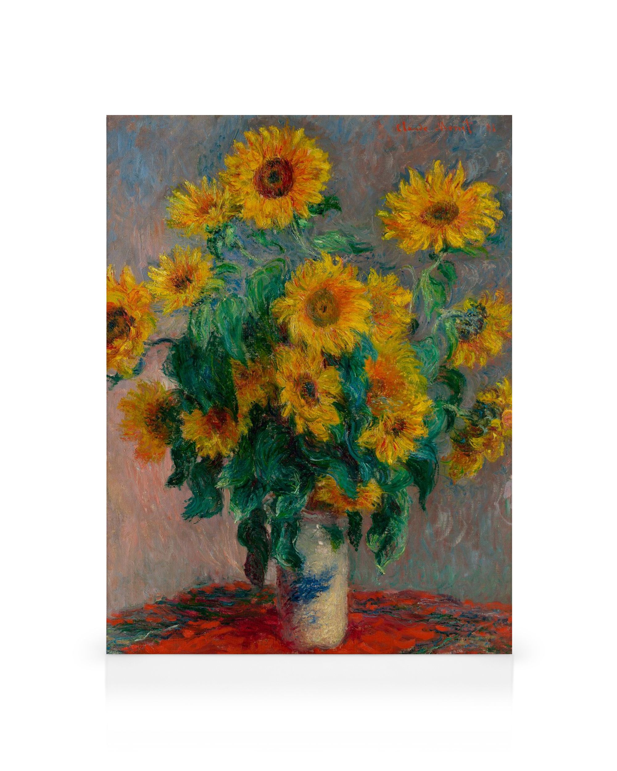 Ab 9,10 €Ein Leinwandbild mit gelben Blumen mit braunen Zentren in einer weiß-blauen Vase, umgeben von grünen Blättern. Die Blumen und Blätter sind dick aufgetragen und mit sichtbaren Pinselstrichen auf einem grauen Hintergrund gemalt und ruhen auf einer roten Oberfläche.