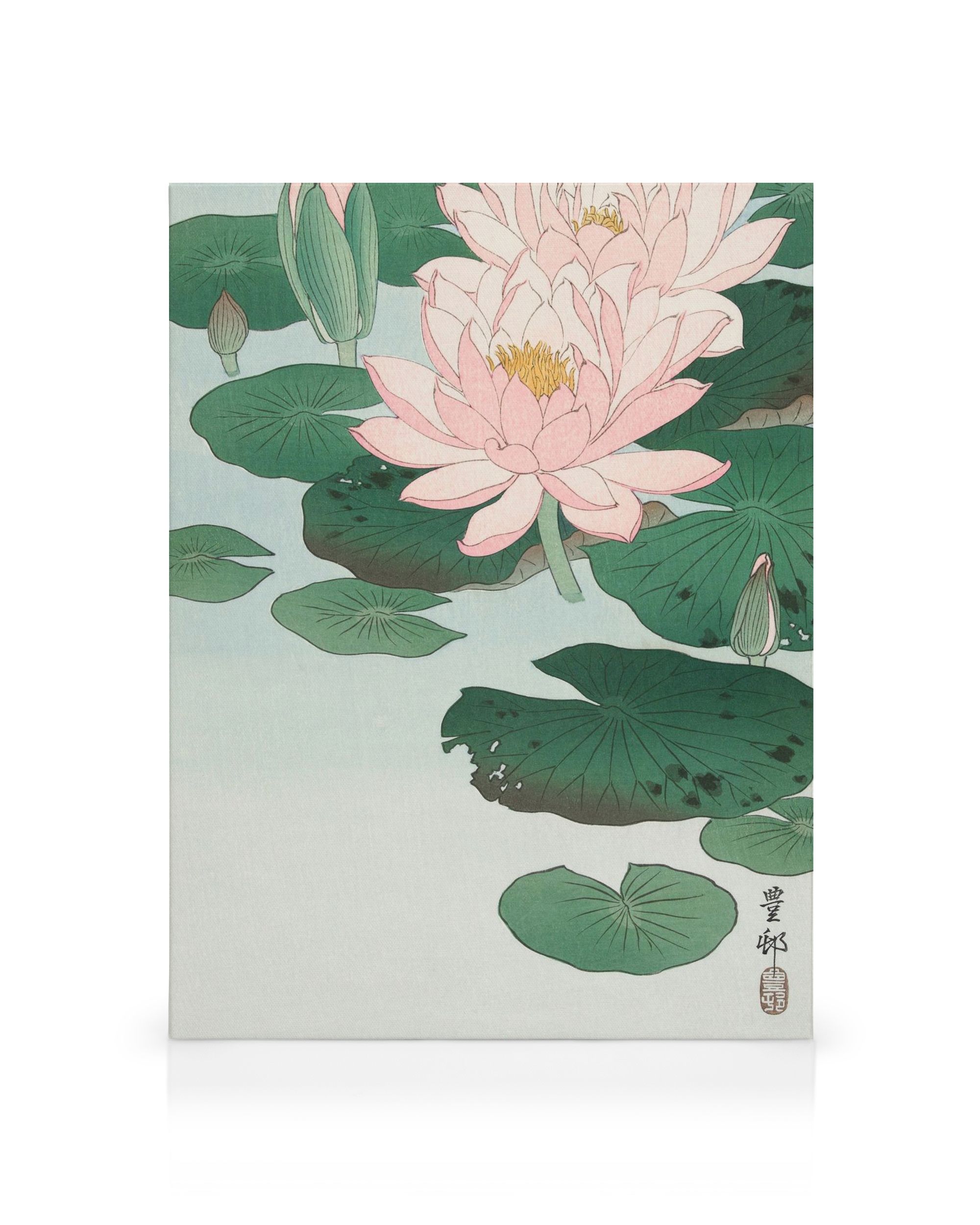 Ab 19,96 €Ein Leinwandbild, das eine rosa Lotusblume und grüne Blätter im ostasiatischen Stil zeigt. Es hat einen Stempel und eine Unterschrift.