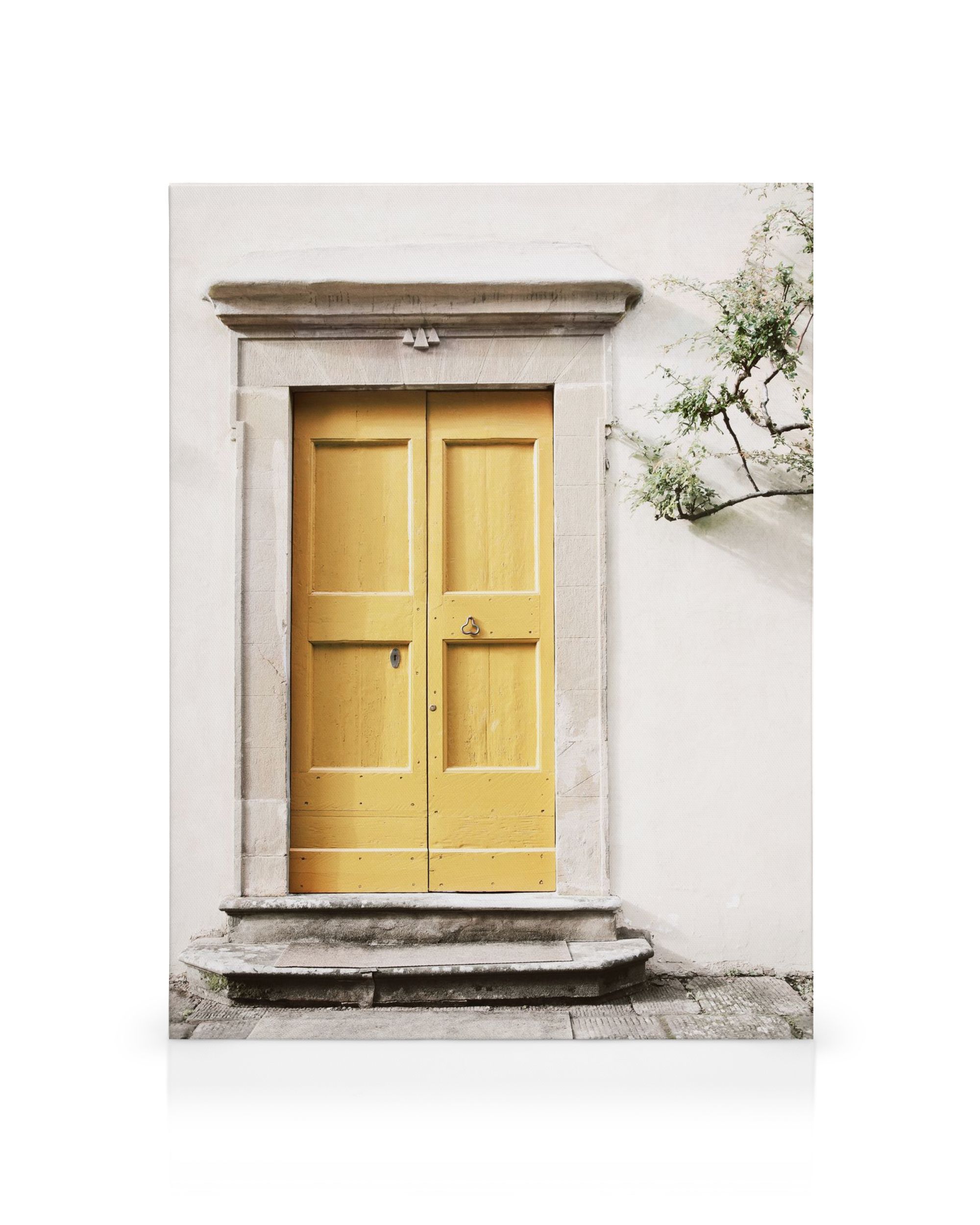 Ab 8,45 €Ein Leinwandbild einer gelben Tür, die in eine weiße Steinmauer eingebettet ist, mit Stufen, die nach oben führen, und einer Pflanze auf der rechten Seite. Perfekte Wandkunst für deine Bilderwand.