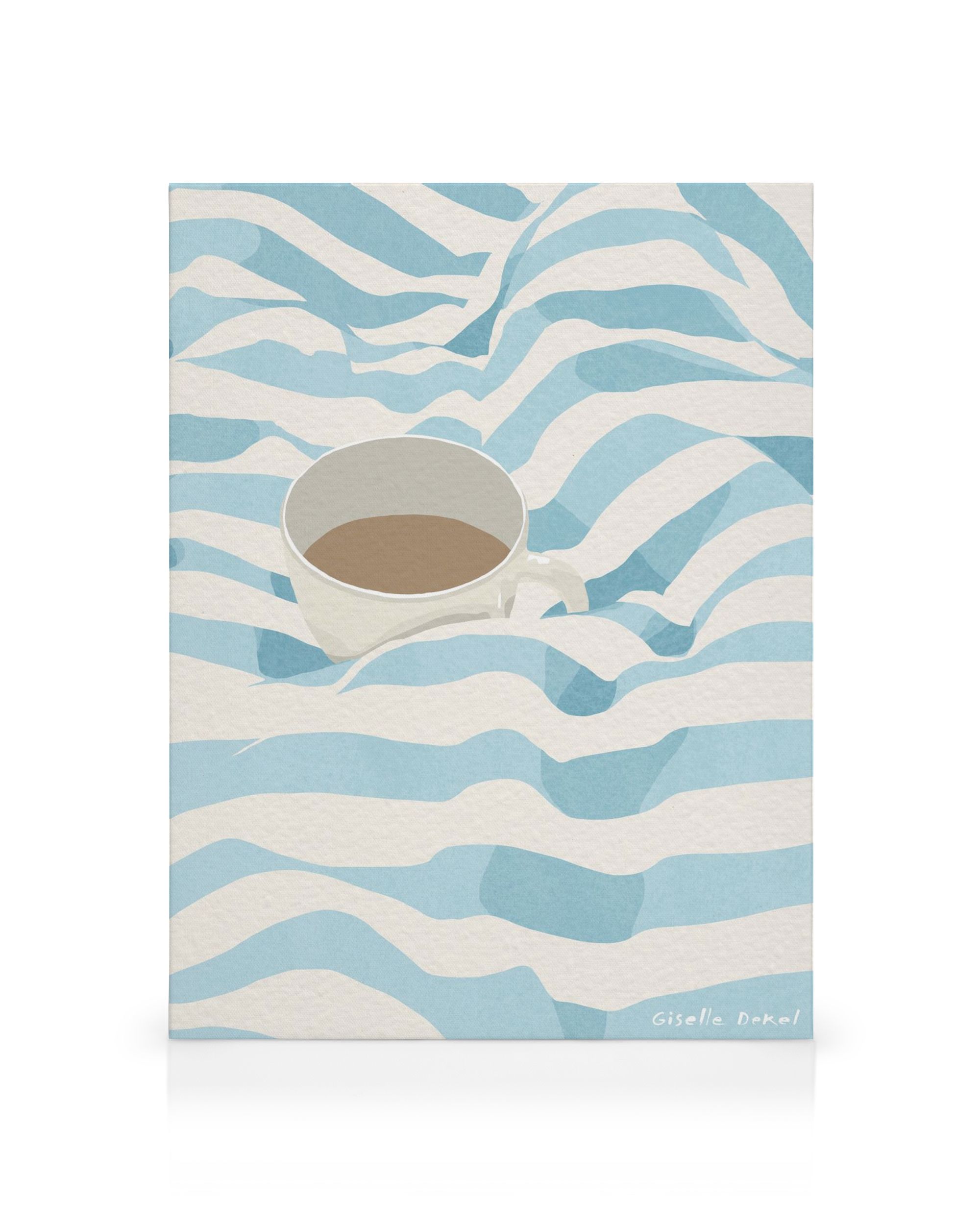 Ab 11,97 €Ein stilvolles Leinwandbild mit einem gemusterten Hintergrund aus wellenförmigen blauen und weißen Streifen, überlagert mit einer gemütlichen Tasse Kaffee. Die perfekte Wandkunst, um deine Küche oder dein Wohnzimmer aufzuhellen.