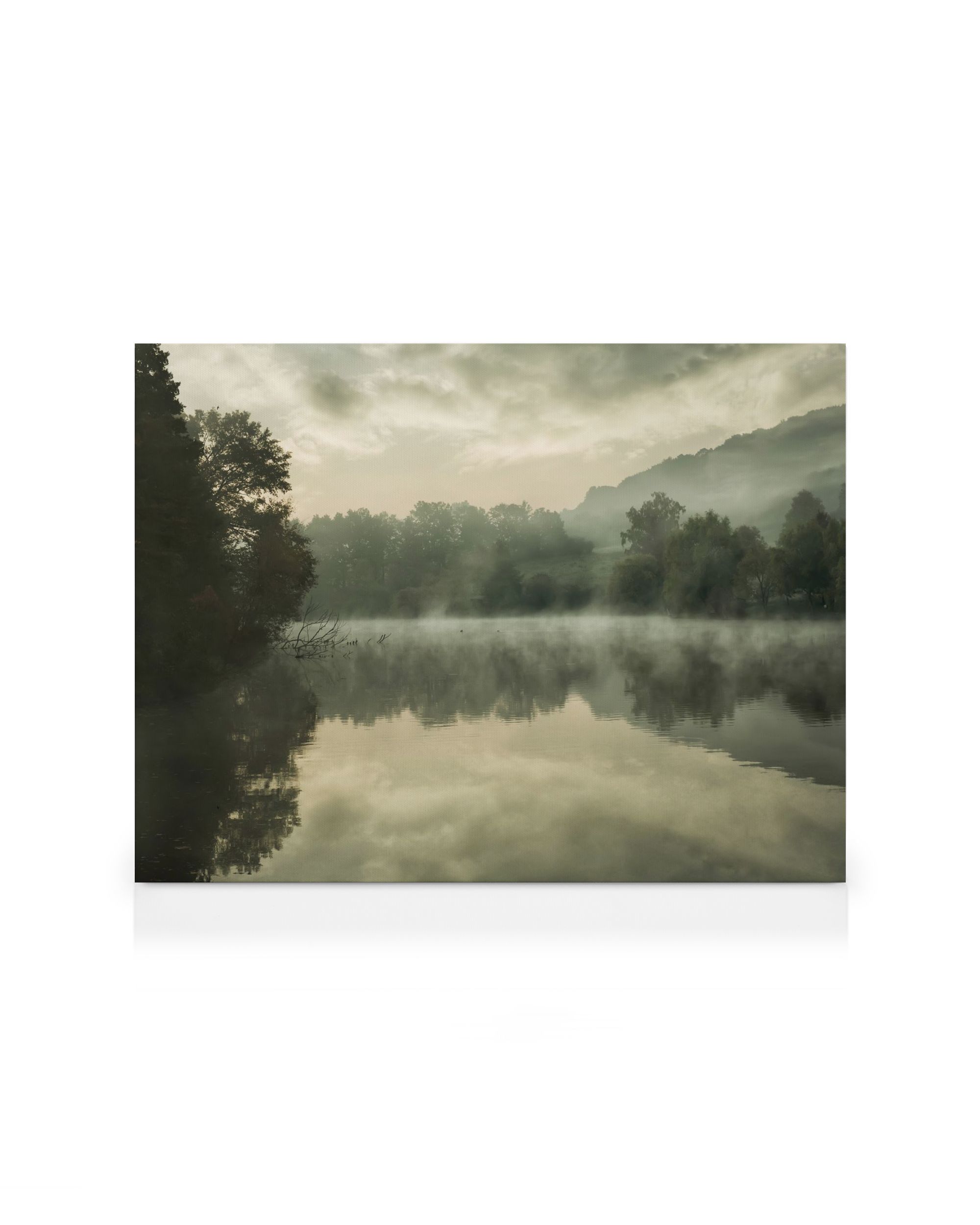Ab 19,96 €Ein schönes Leinwandbild, das einen nebligen See mit Bäumen zeigt, die sich im stillen Wasser spiegeln, und nebelige Hügel im Hintergrund. Eine ruhige Szene in gedämpften Grüntönen, Grau und Weiß.