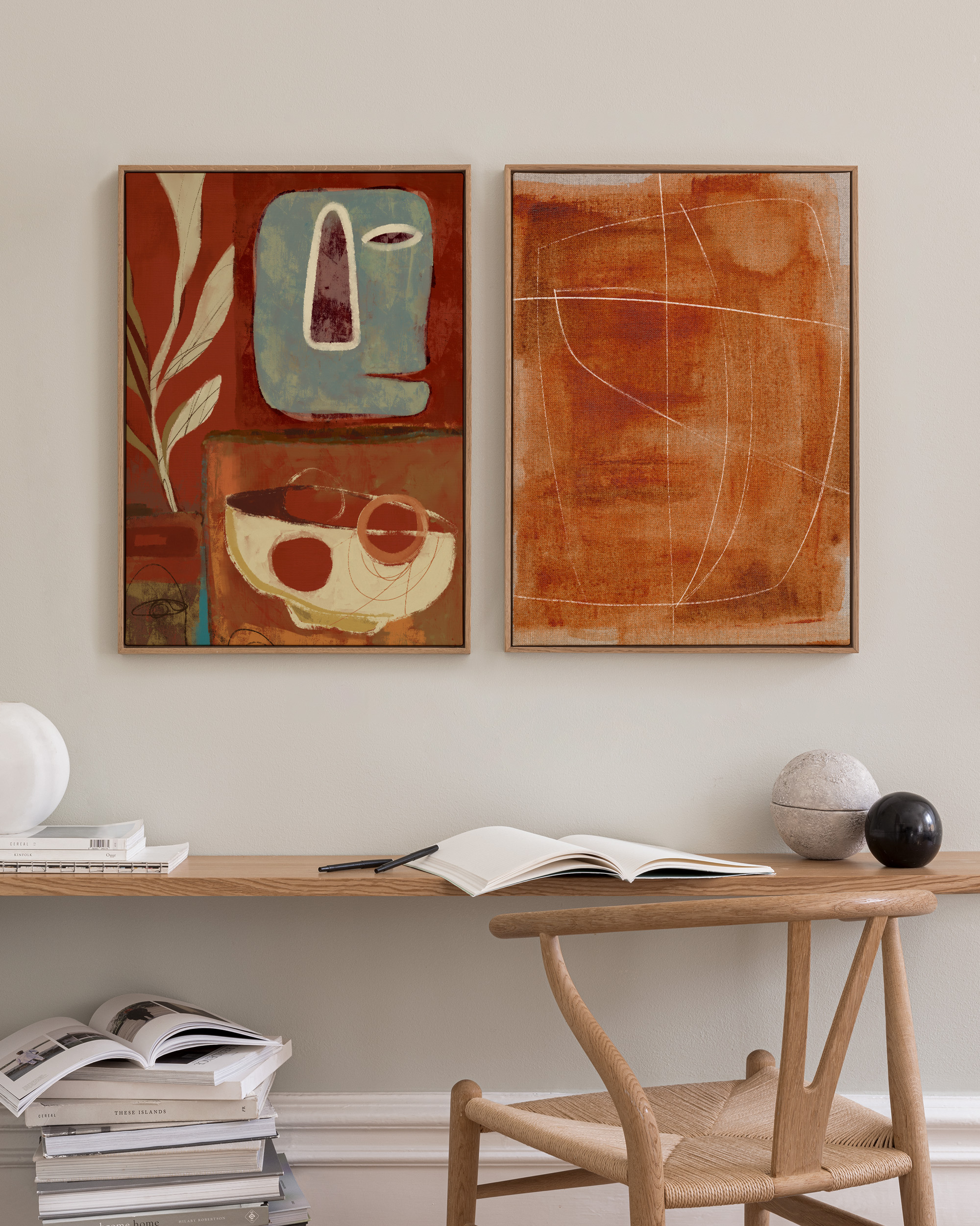 Zwei abstrakte Leinwandbilder in Orange, Blau, Rot und Beige. Perfekte Wanddekoration für dein Zuhause.