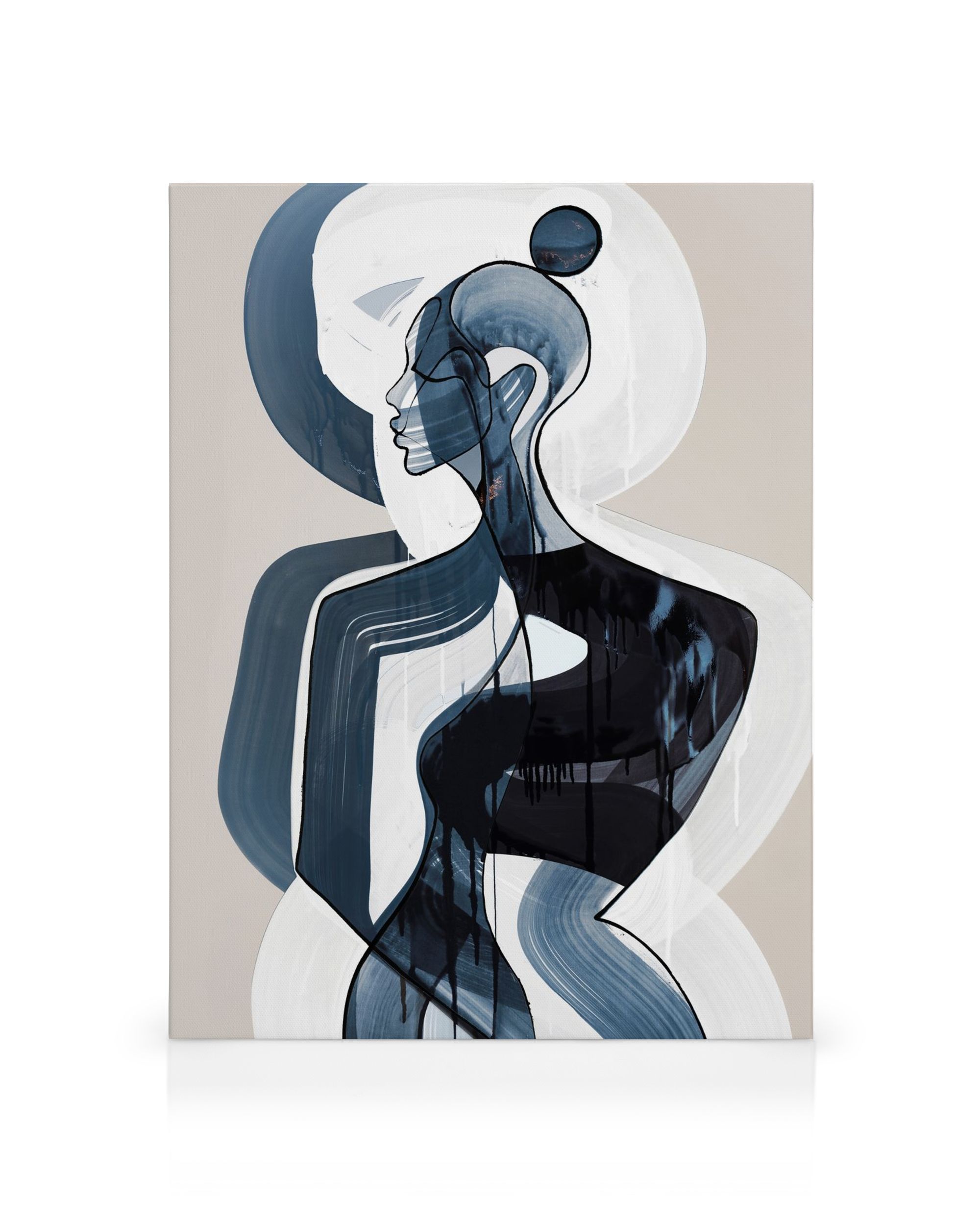 Ab 24,95 €Ein abstraktes Leinwandbild mit fließenden Formen in Blau, Schwarz und Weiß auf einem beigen Hintergrund. Die geschwungenen Linien und kräftigen Farben verleihen dieser Wandkunst einen modernen Look.