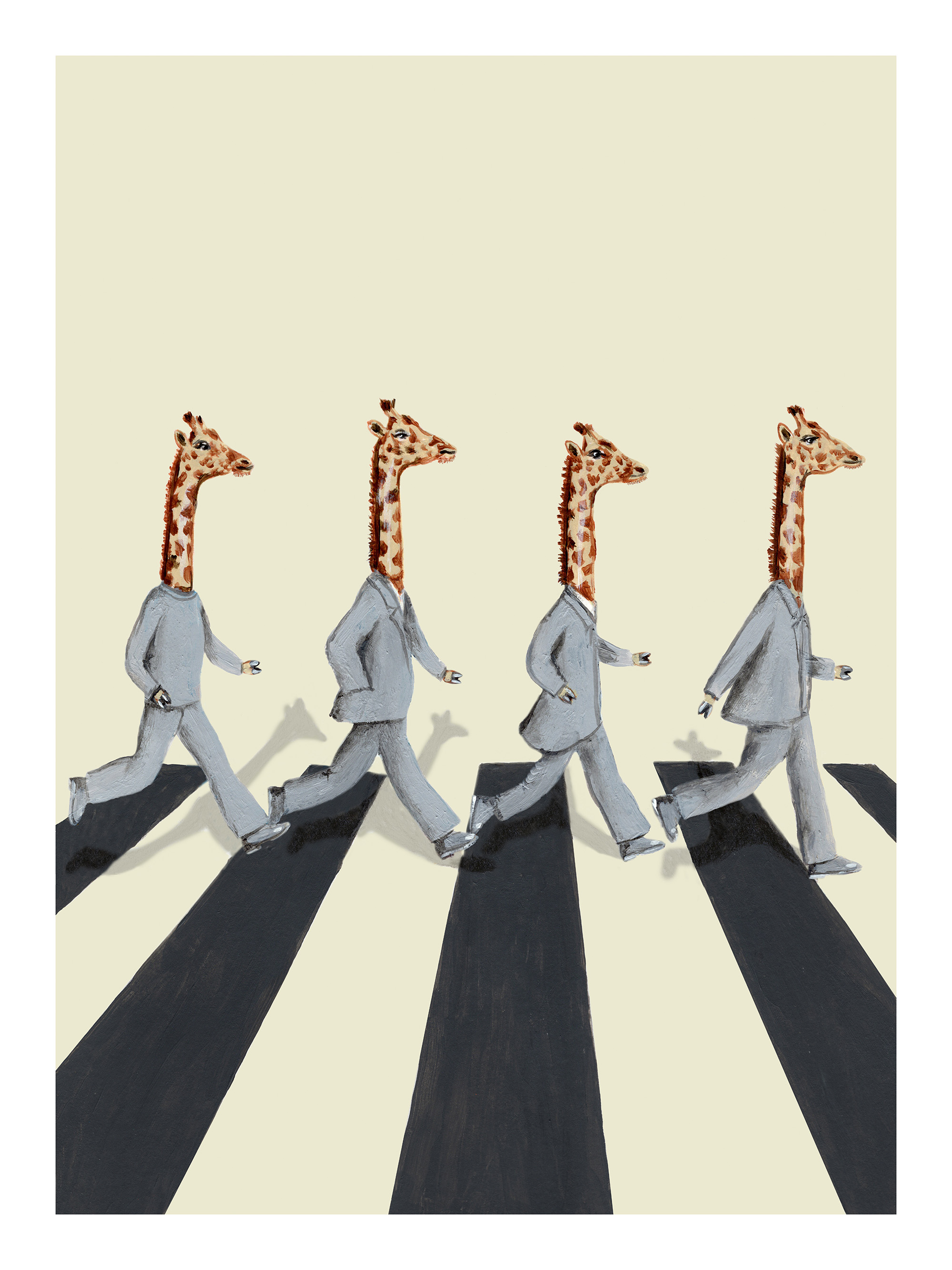 Surreales Poster mit vier Giraffen in grauen Anzügen, die über einen Zebrastreifen auf hellbeigem Hintergrund laufen.
