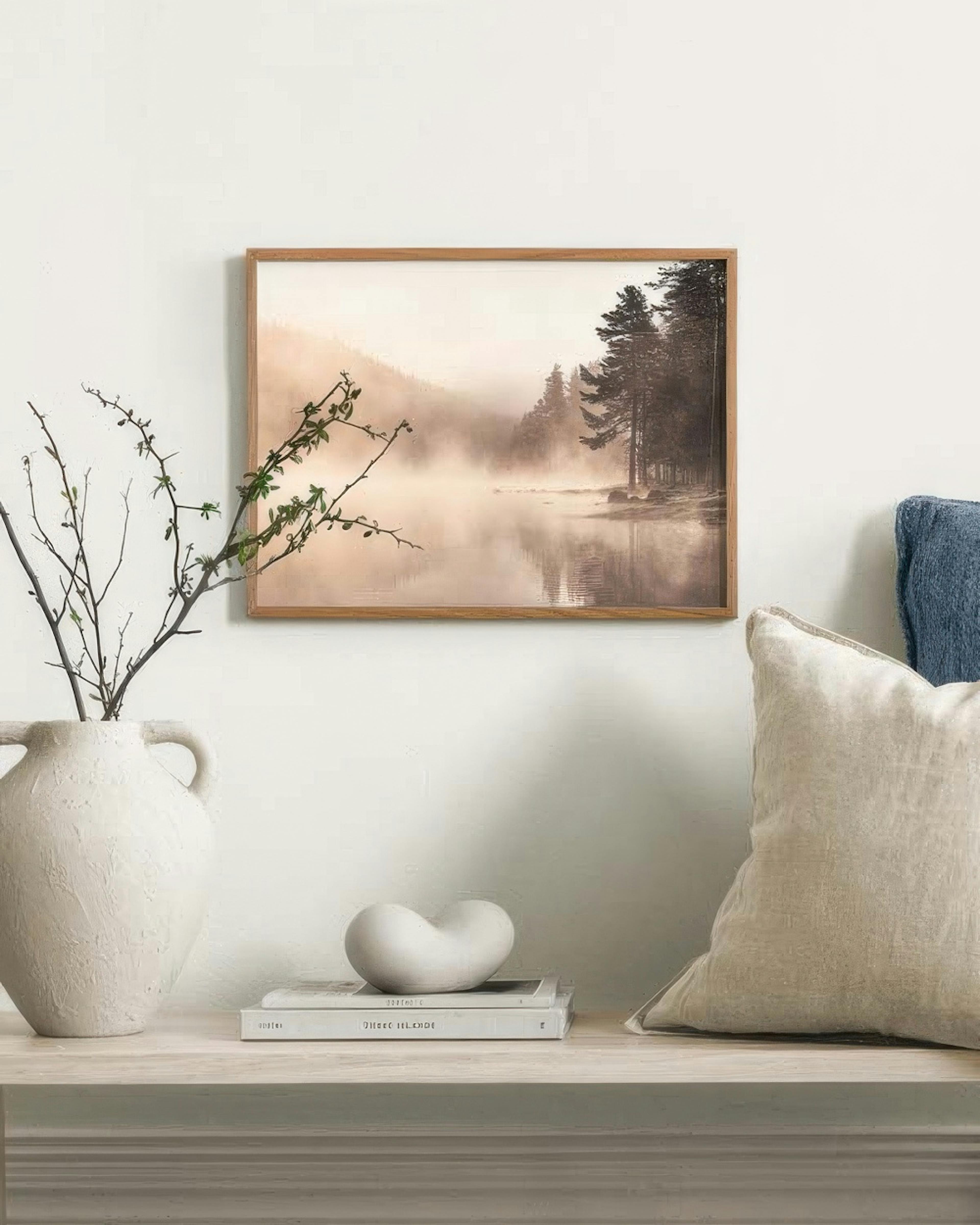 Fotoposter eines Sees, der mit einer dicken Nebelschicht bedeckt ist. Die gedämpften Farben dieser sanften Landschaft machen sie zur perfekten Ergänzung für ein ruhiges Schlafzimmer oder ein gemütliches Wohnzimmer. Wo auch immer du es platzierst, es wird eine traumhafte Atmosphäre in den Raum bringen.