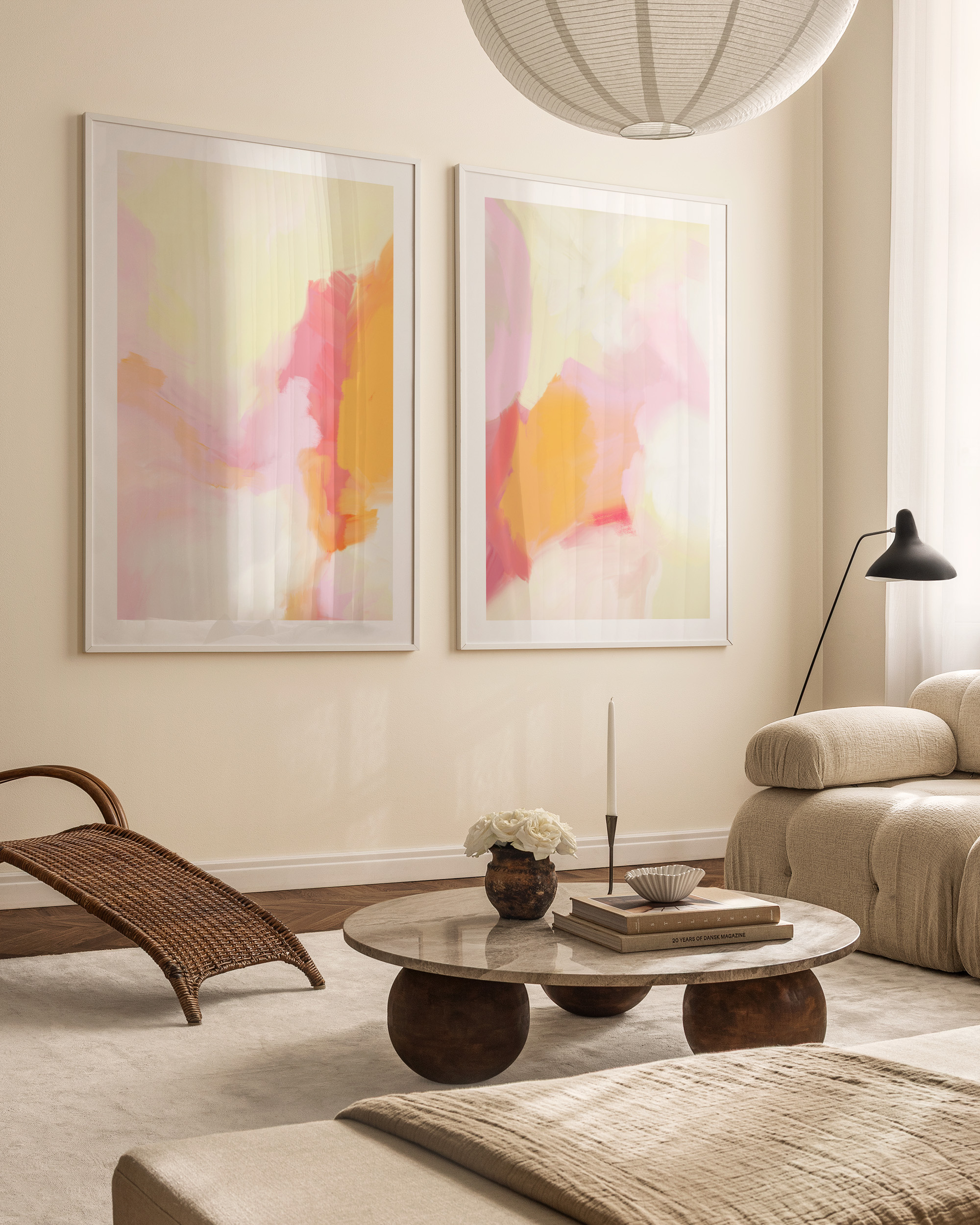 Abstraktes Gemälde von zusammengemischten Farben mit Rosa, Gelb, Weiß und Orange. Kombiniere dieses Poster mit "Painterly Expression No1" für ein perfektes Paar.