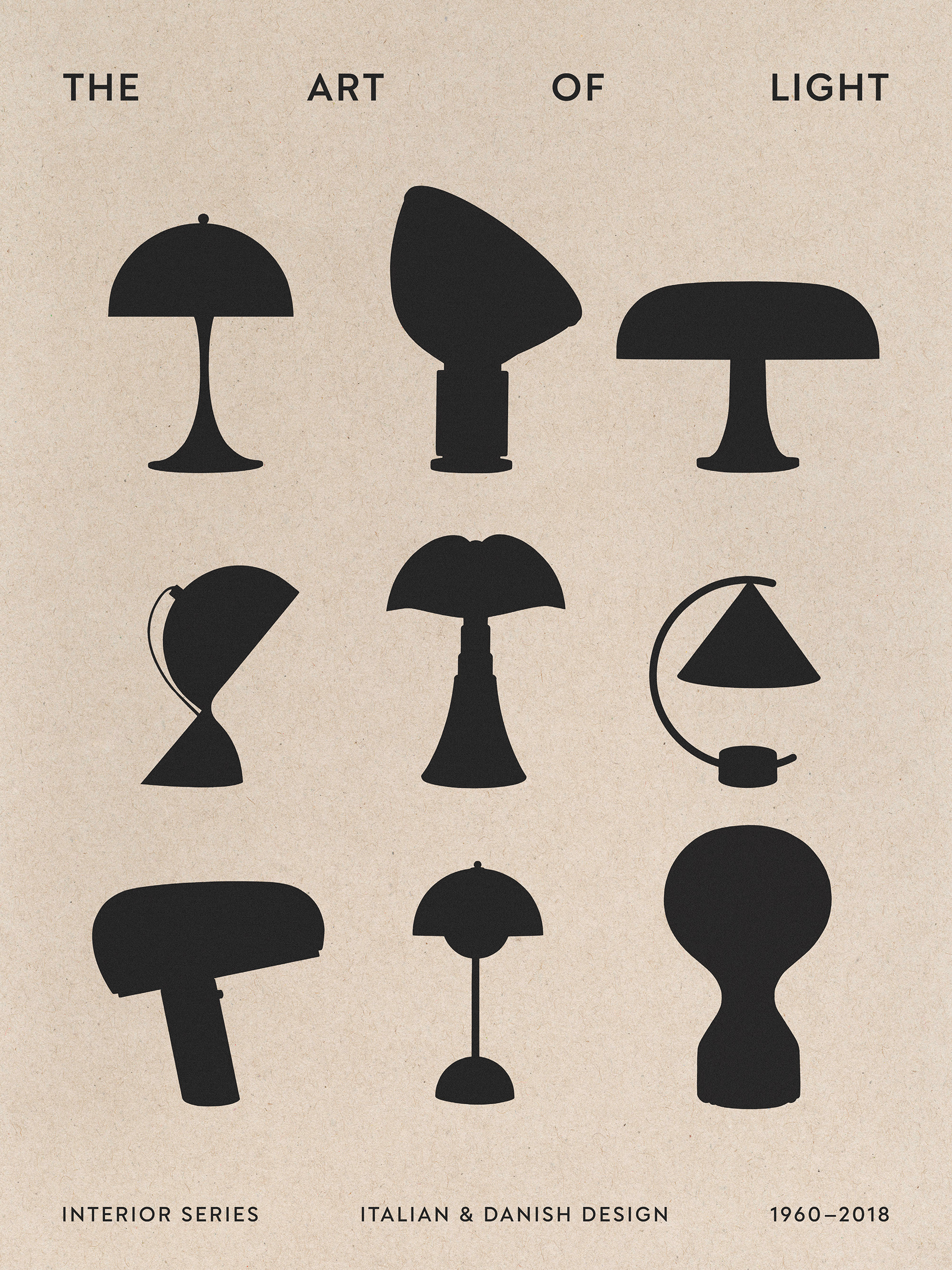 Ab 24,95 €Neun schwarze Lampen-Silhouetten in verschiedenen Formen auf beigem Hintergrund. Dieses minimalistische Poster zeigt den Text "The Art of Light" und präsentiert italienisches und dänisches Design von 1960-2018.