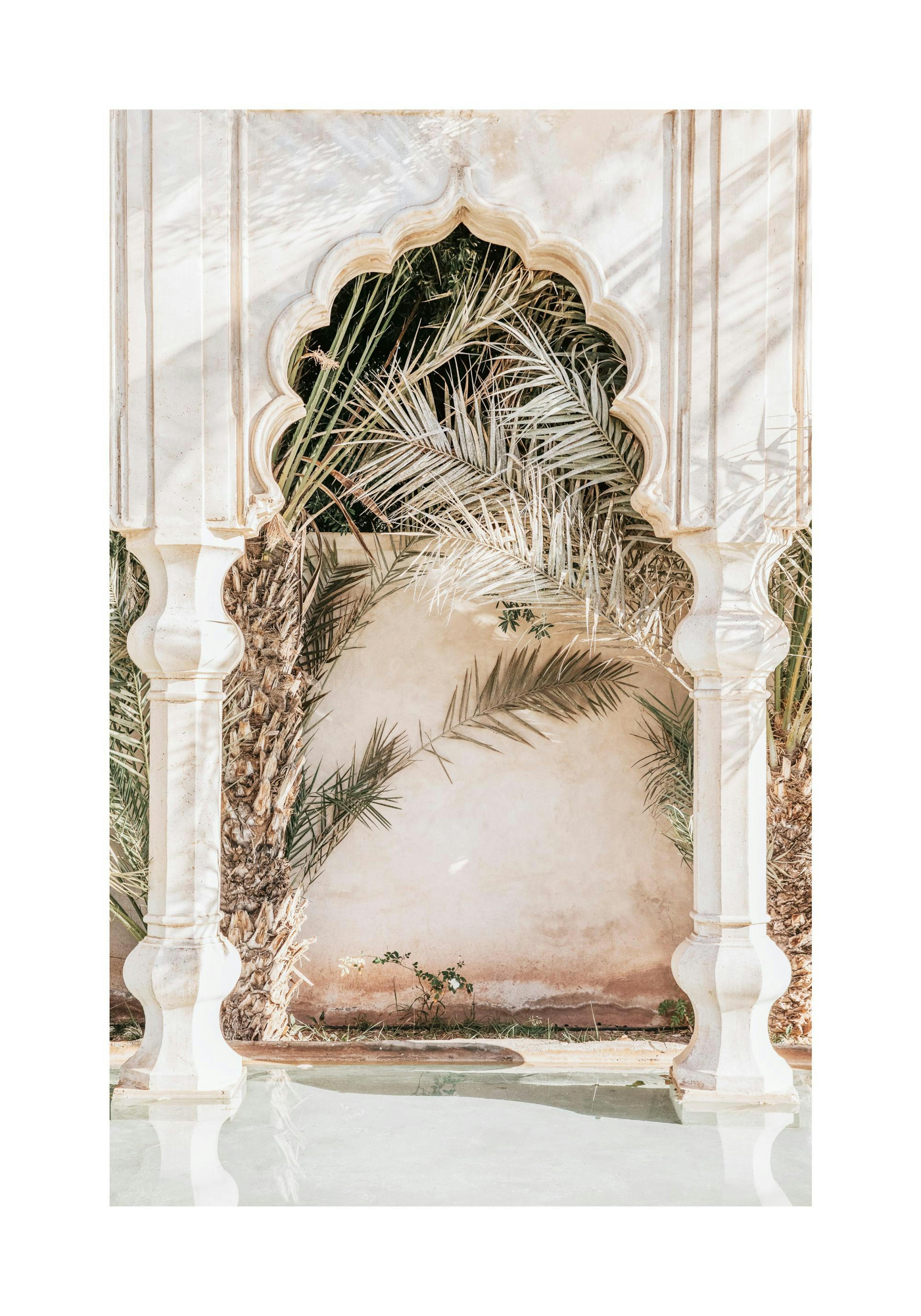 Photographie d'ombres sur une arche incurvée et des pilliers au bord d'une piscine. Avec ses coins mystérieux et ses teintes magnifiques, Marrakech a clairement quelque chose de spécial ! Ce poster fait partie de Studio Amara, une collection réalisée par le Studio Design de Desenio à Marrakech.