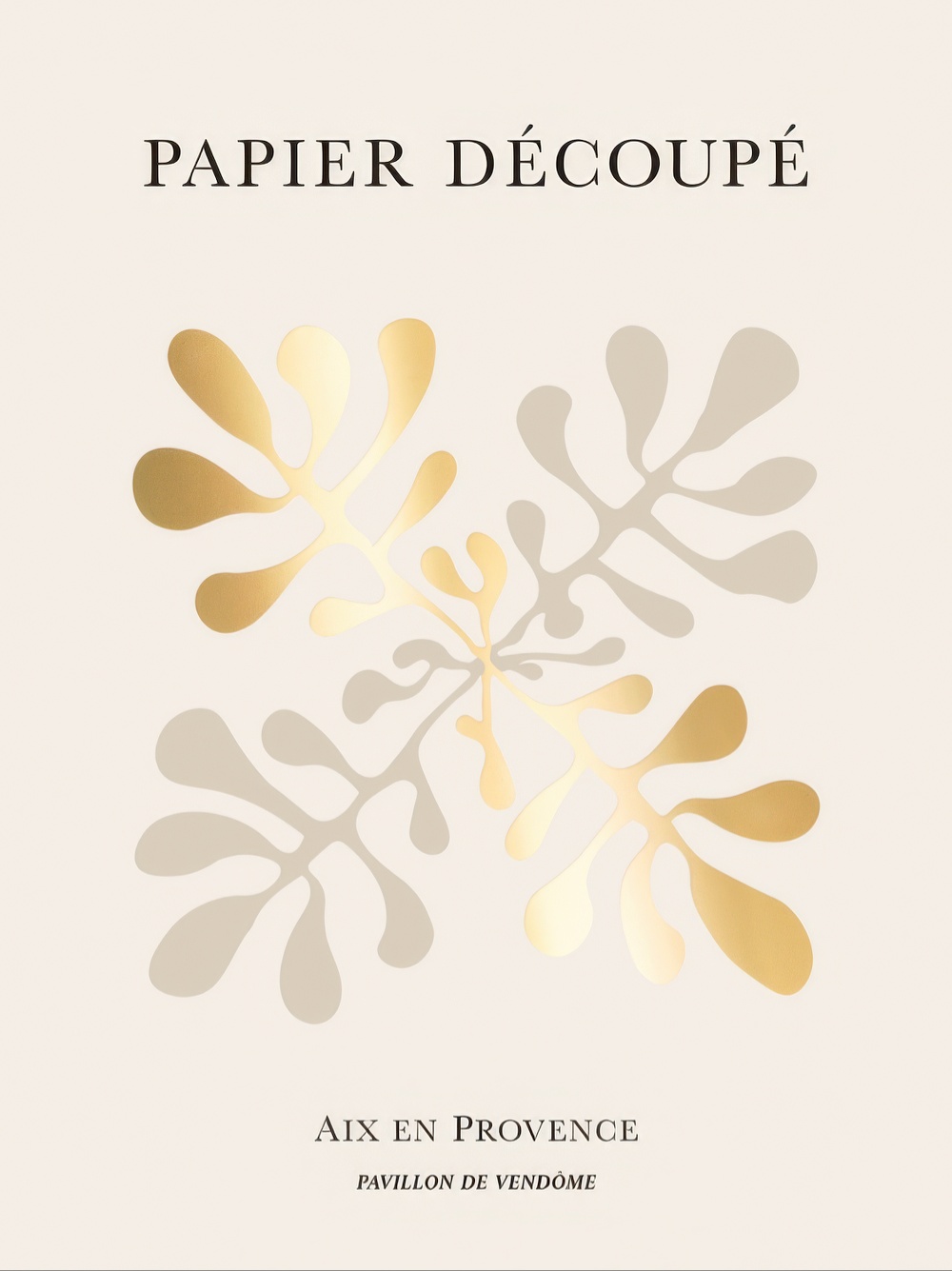 Illustration graphique avec des feuilles abstraites en beige et en feuille d’or sur un fond beige clair, avec du texte au-dessus et en dessous. Avec des affiches agrémentées d’une feuille d’or, vous obtiendrez cette impression haut de gamme, et ce style est parfait pour ajouter une touche de luxe à un intérieur clair.