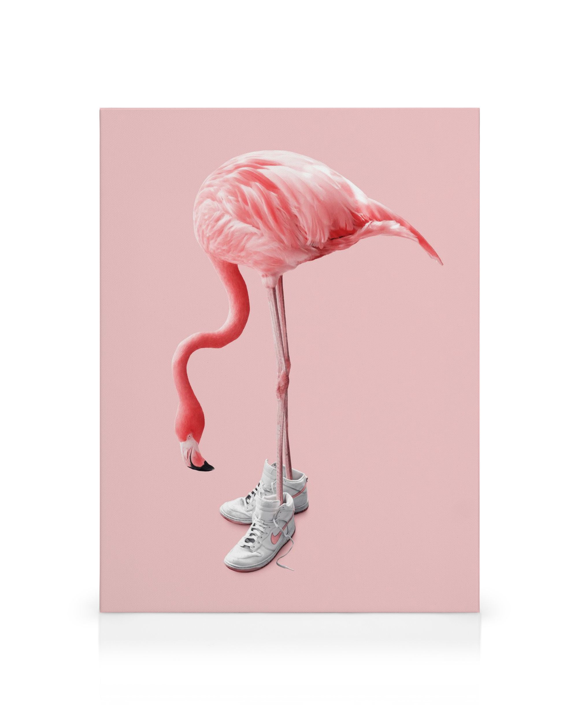 À partir de 24,95 €Une toile amusante représentant un flamant rose en baskets blanches, se tenant sur une patte sur un fond rose uni.