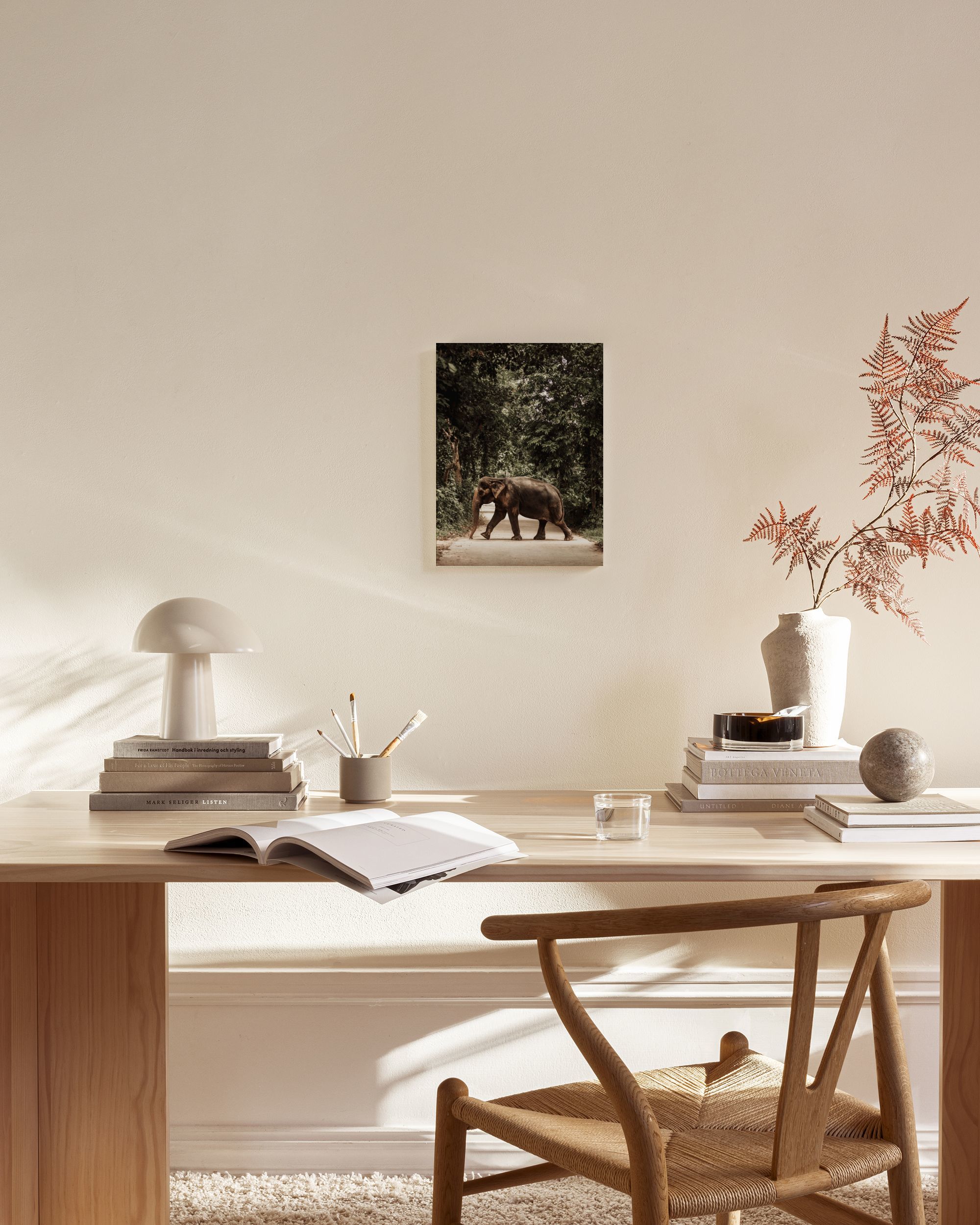 Une toile paisible d'un éléphant marchant à travers un sentier forestier luxuriant et verdoyant.