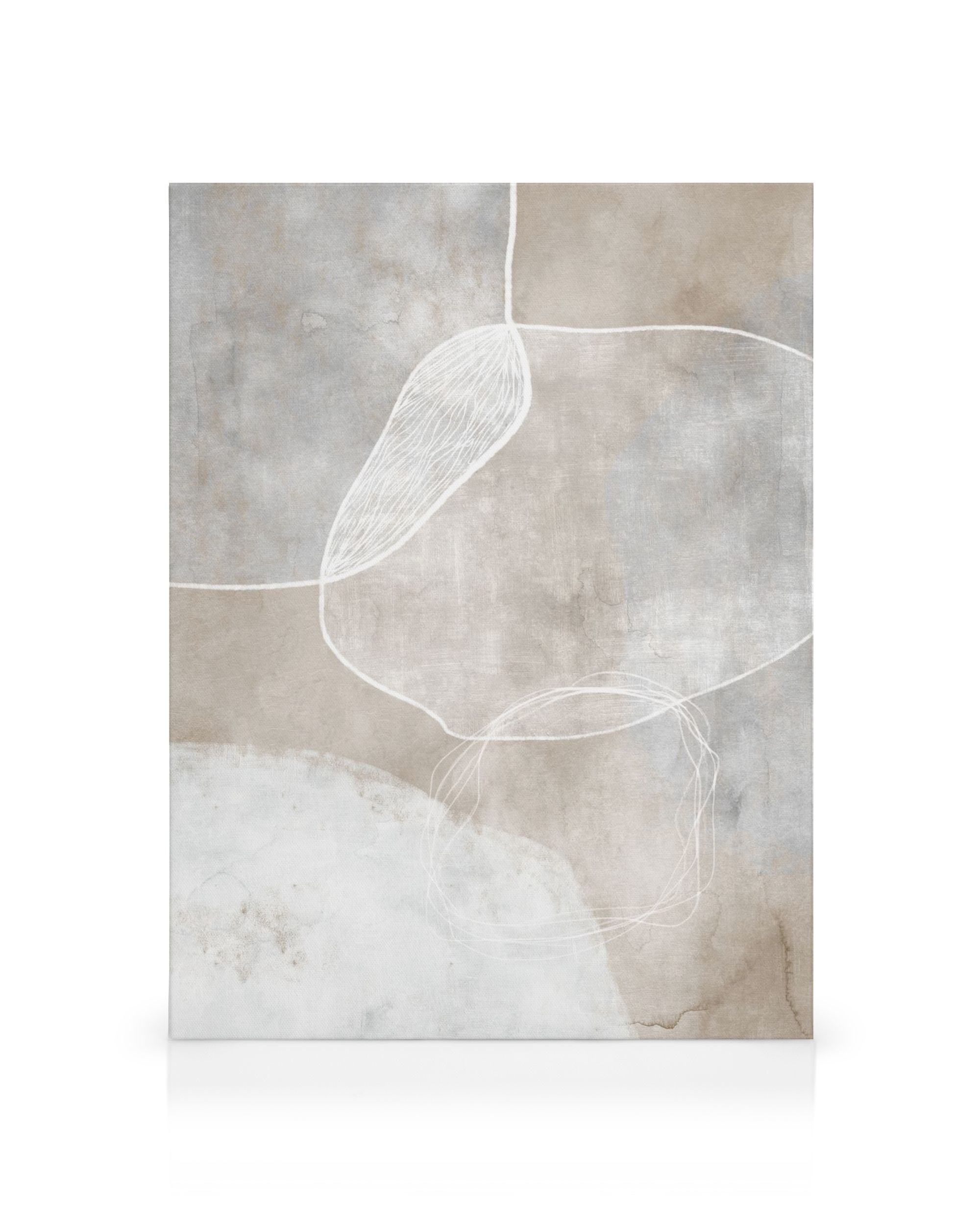À partir de 24,95 €Une toile abstraite présentant une forme organique ressemblant à une feuille, formée par des lignes blanches sur un fond beige et bleu. Une œuvre d'art texturée unique pour animer votre décoration murale.