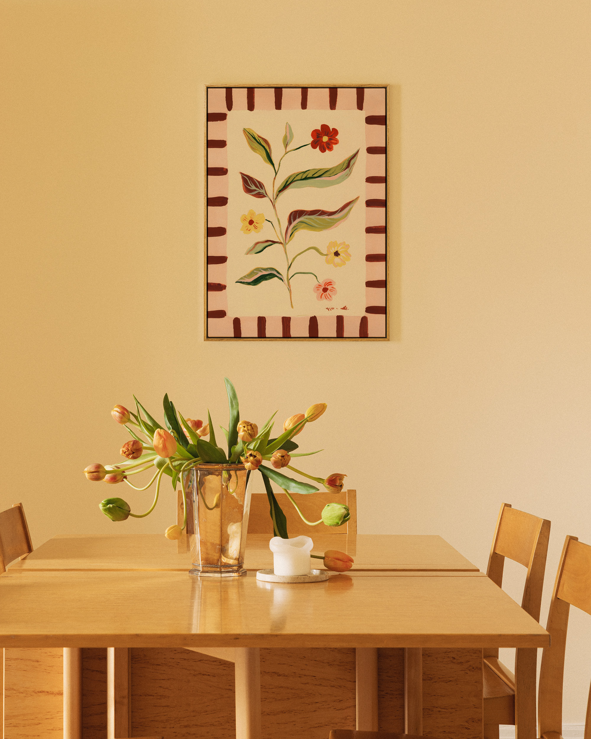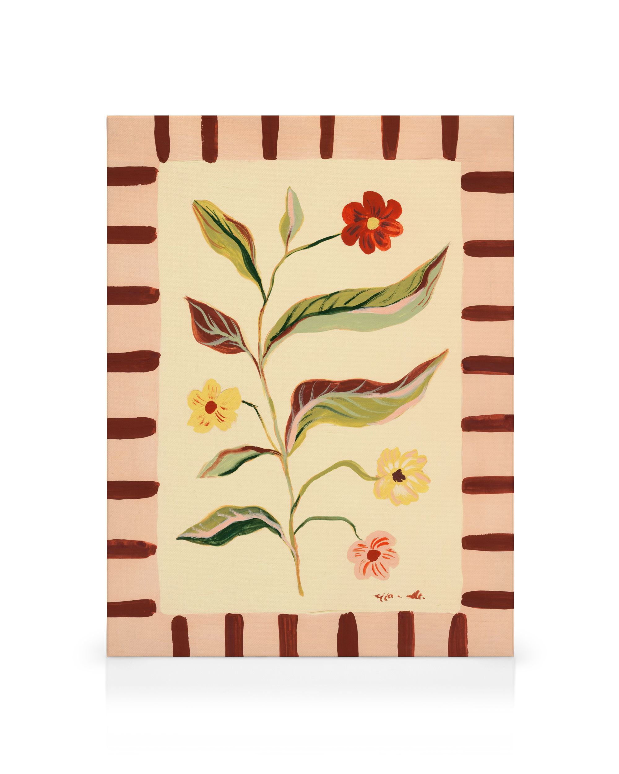 Een canvas van een groene plant met grote bladeren en vier kleurrijke bloemen in rood, geel en roze op een beige achtergrond met bruine strepen.