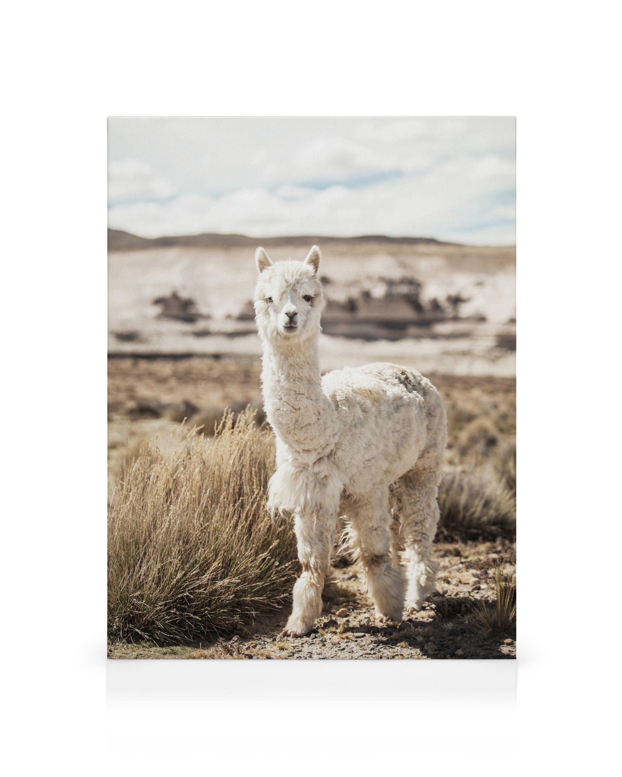 Vanaf € 24,95Mooie fotocanvas van een witte alpaca met pluizige vacht die op een zandpad staat en naar de camera kijkt. Perfecte wanddecoratie voor jouw huis.