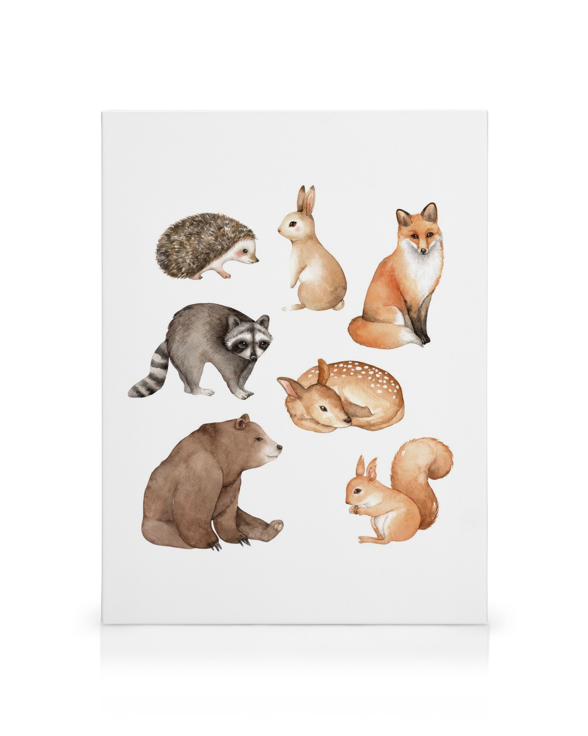 Vanaf € 24,95Een canvas met aquarel illustraties van zeven bosdieren, waaronder een konijn, egel en beer. Met natuurlijke kleuren op een effen achtergrond, dit maakt de perfecte muurdecoratie voor de kinderkamer.