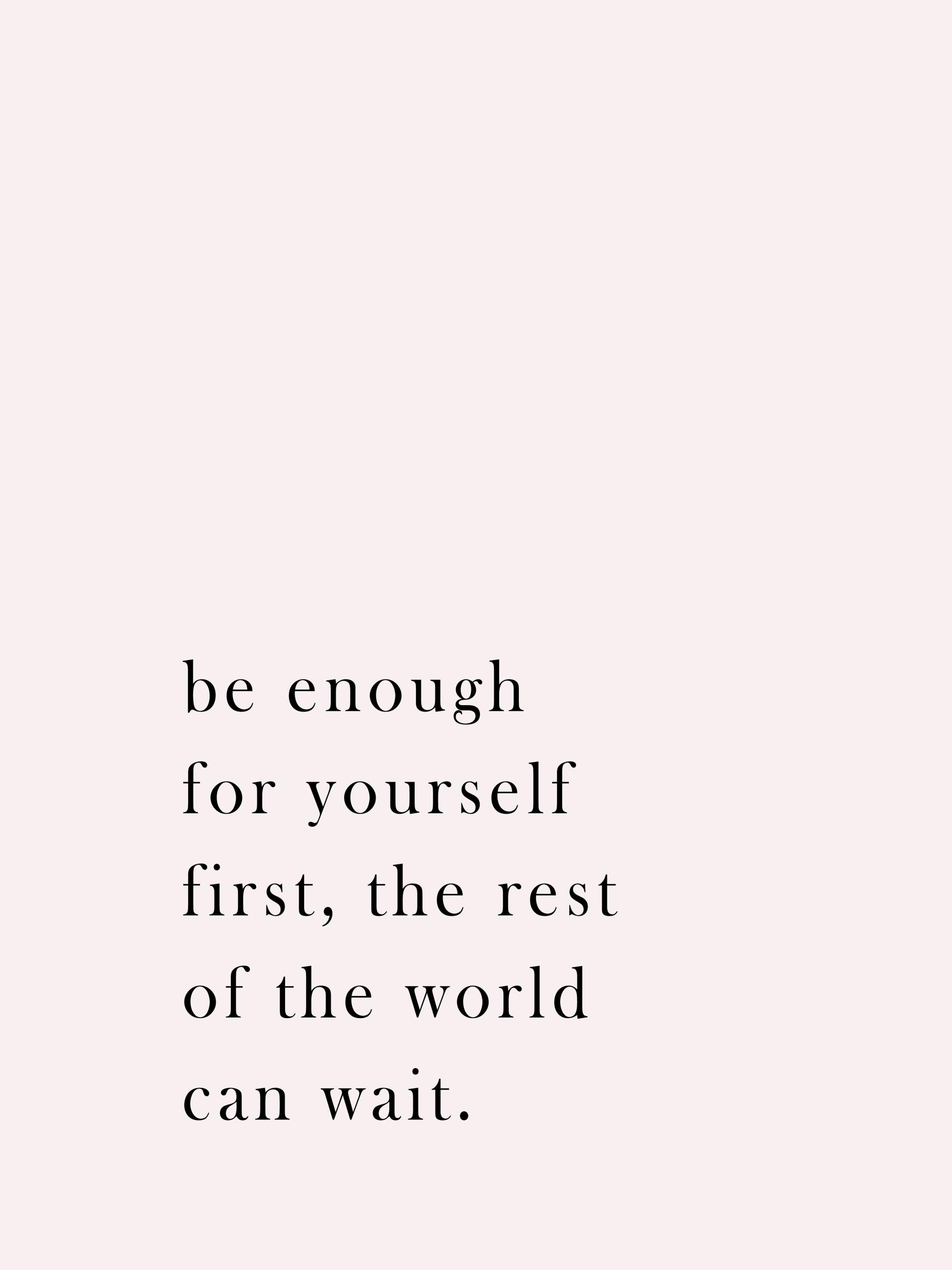 Vanaf € 3,90Quote poster met de tekst 'Be enough for youself first, the rest of the world can wait.' in zwarte tekst en roze/paarse achtergrond. Een tekstposter is de beste basis om te beginnen met het bouwen van een fotowand. Ga hier aan de slag!