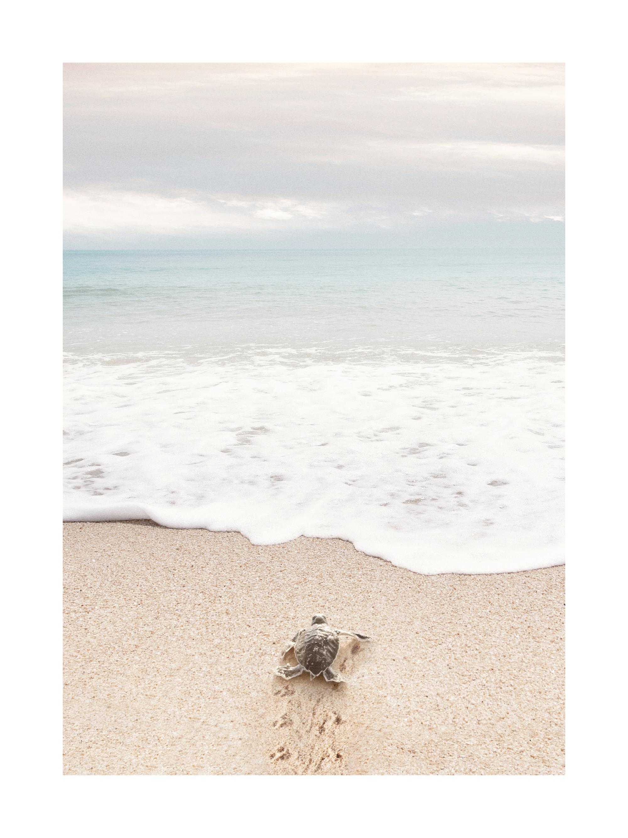 Foto van een schildpadje op het strand, kruipend naar de grote oceaan. Zelfs wie klein is, mag groot dromen! Misschien herinnert deze poster je eraan niet bang te zijn voor het onbekende en je nieuwsgierigheid te behouden.