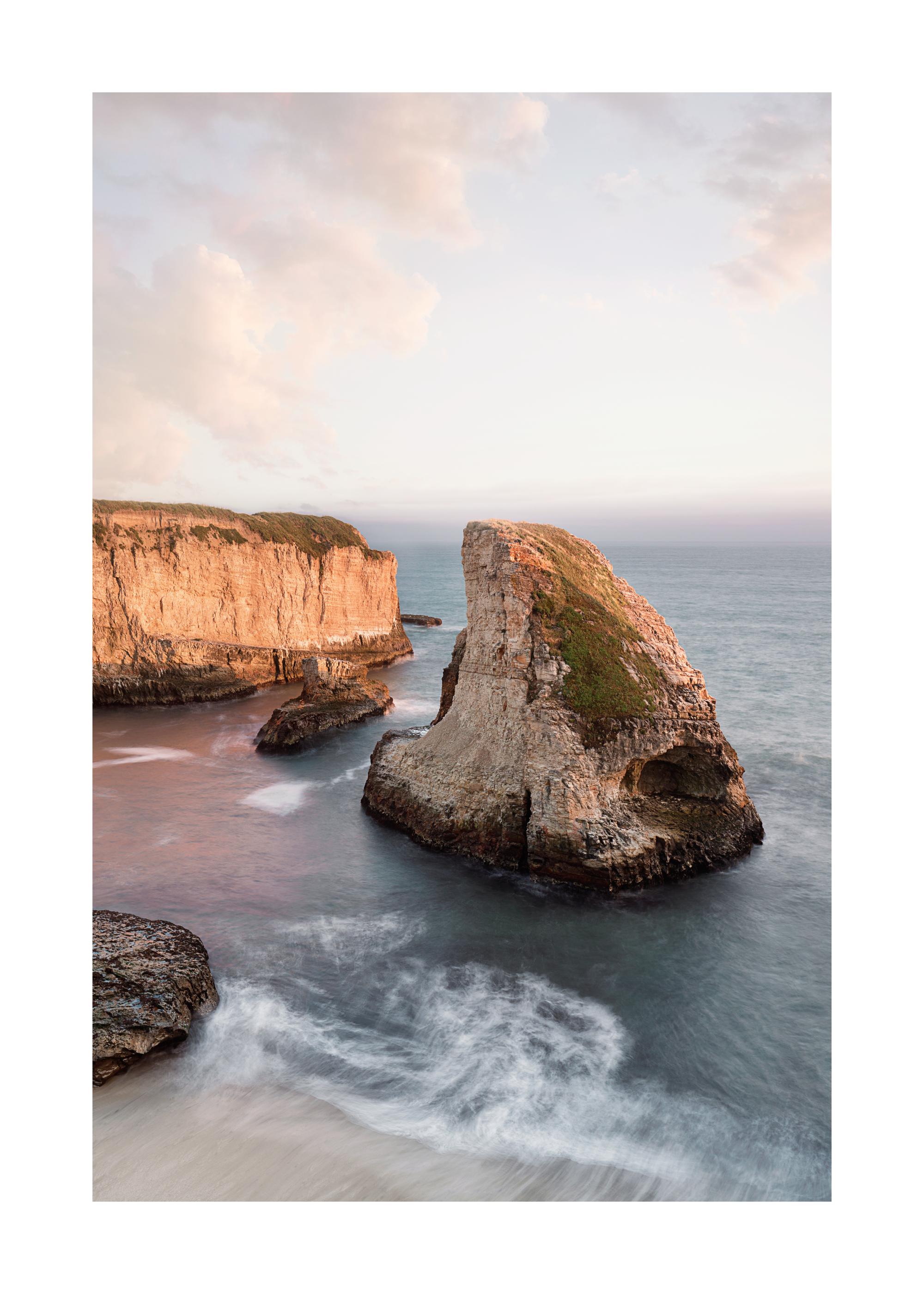 Foto van een klif in het water aan het strand. Poster van een prachtige creatie door de aarde. <br><br>De poster is gedrukt met een witte rand rond de afbeelding die het ontwerp mooi inkadert.