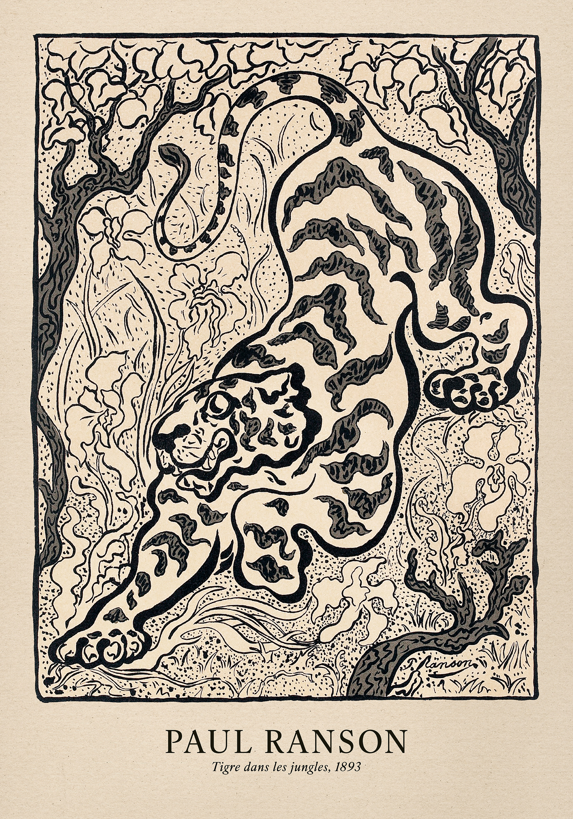 Ab 6,50 €Ein schwarz-weißes Poster eines Tigers mit markanten Streifen in einer Dschungelkulisse. Dieses Poster im Vintage-Stil zeigt dicke, geschwungene Linien und dekorative Muster.